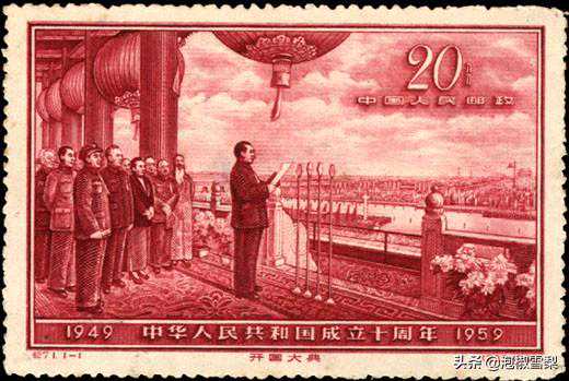 新中国成立十周年之际,中国邮政于1959年9月28日至10月1日先后发行了五组邮票庆祝十年大庆,此套为第五枚,画面采用的是董希文的油画《开国大典》,雕刻者为我国著名雕刻师唐霖坤。