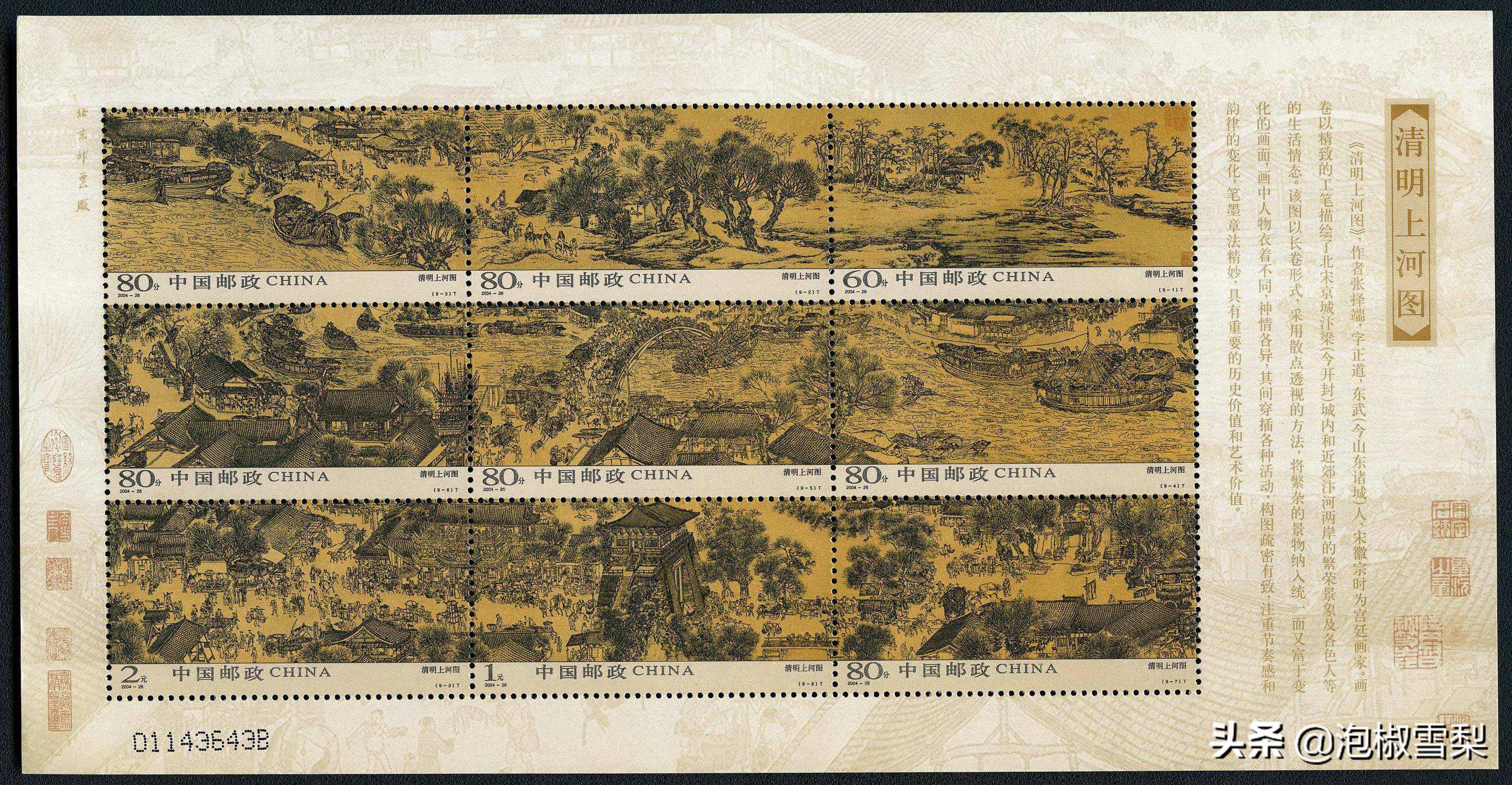 中国画类邮票的精品,高度再现了北宋画家张择端的传世名作。整版邮票就是一副清明上河图的画卷(部分),雕刻细腻、线条流畅,创造了中国邮票发行史的四个第一,即同类题材邮票第一次采用原画作;雕刻版规模最大;引进国际先进胶雕机后印刷的第一套邮票;连票最多的邮票。