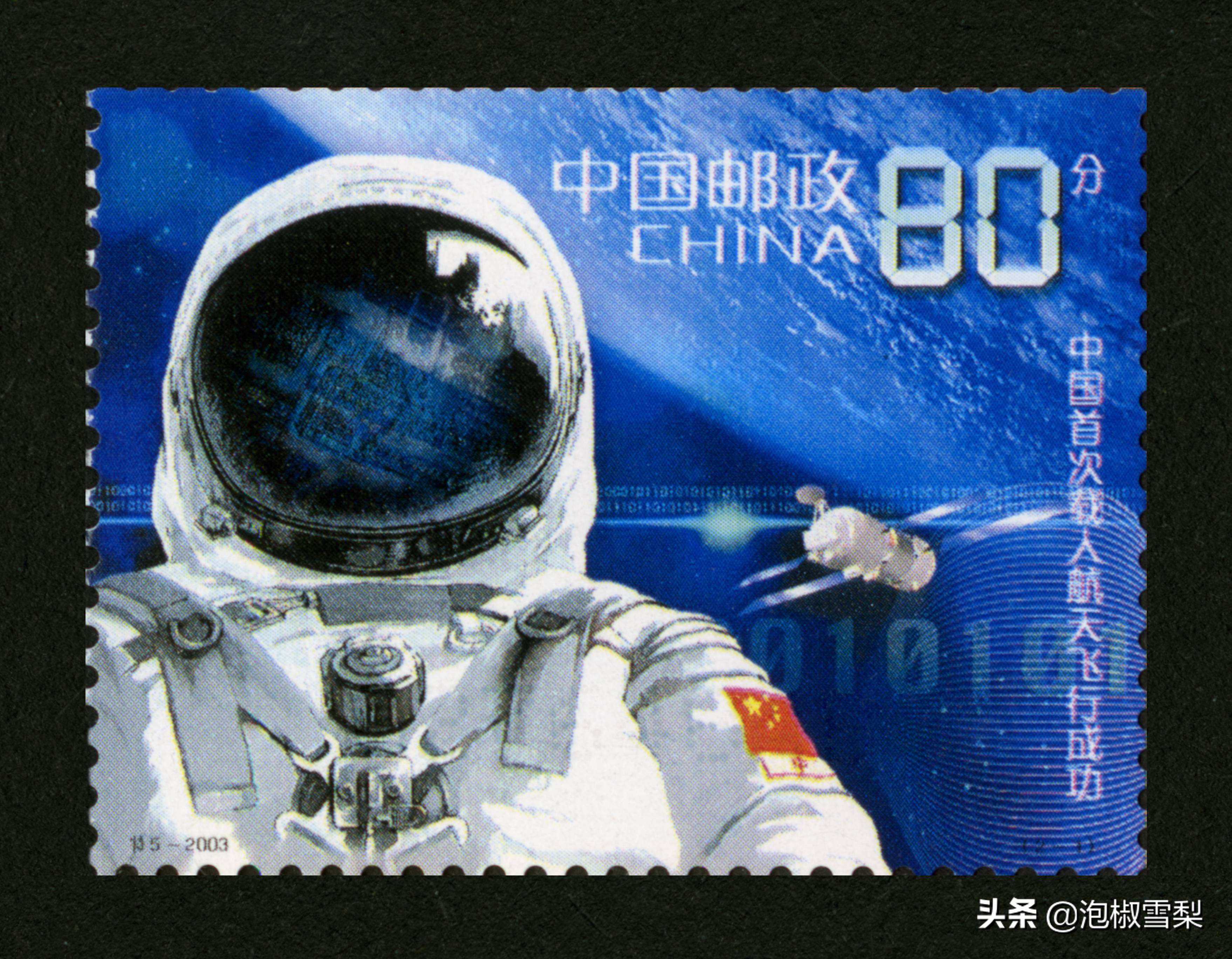 为庆祝中国首次载人航天飞行成功,中国邮政联合港澳邮政特别发行了这套邮票,第一枚“英姿”科技感强烈,中国自主研制的航天服配以宇宙中蓝色的地球,仿佛一幅科幻大片,突出了航天主题。