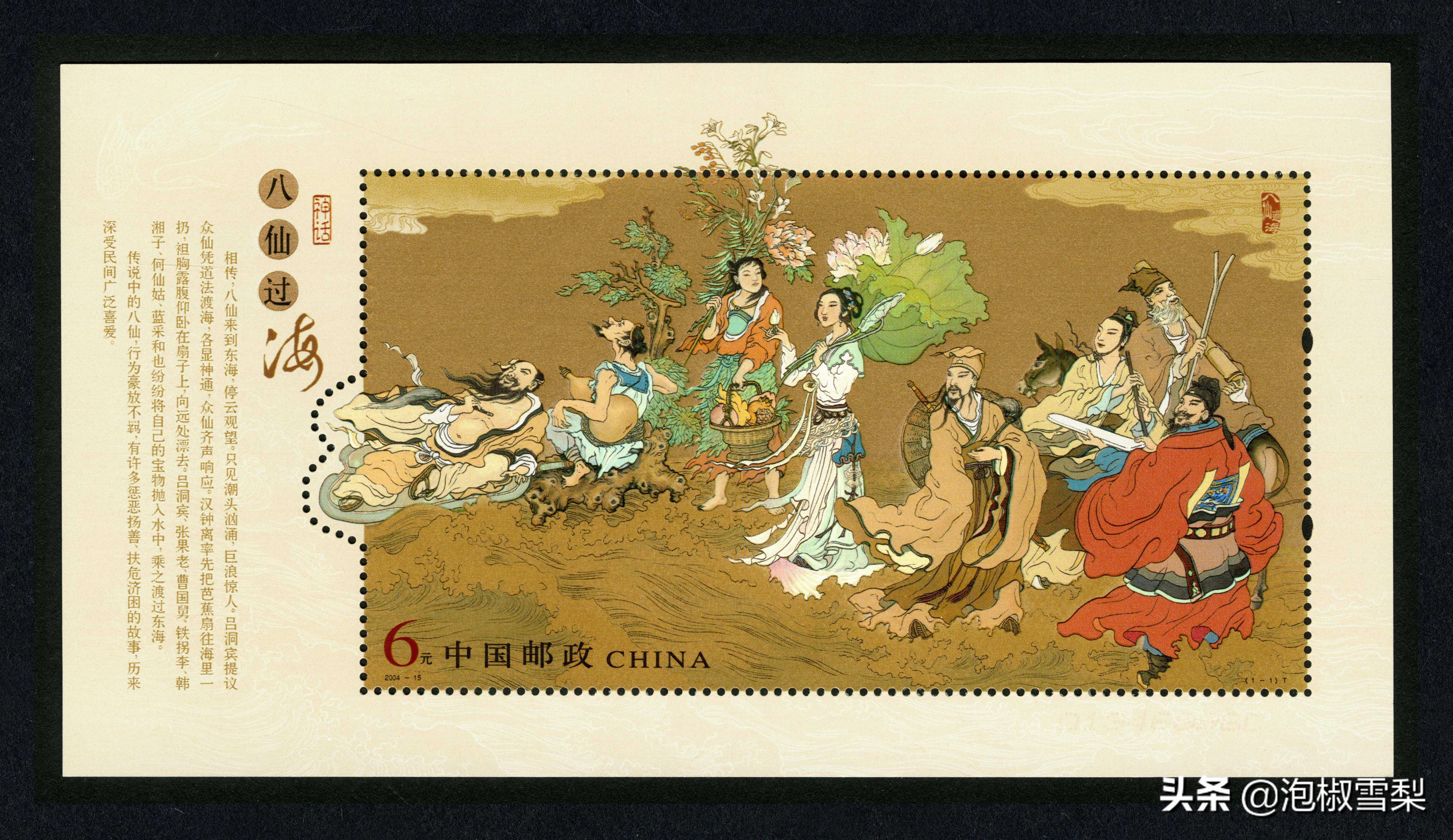 八仙过海的故事妇孺皆知,邮票采用张孝友的画作,生动的描绘了八仙过海的神话故事,工笔画手法纯熟。齿孔巧妙地在汉钟离的右腿侧进行葫芦状打孔,既保留了八仙的完整性,也打破了小型张的传统格局,让人眼前一亮。