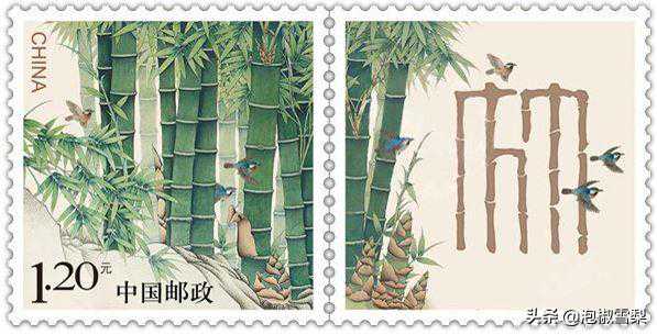 邮票主图竹子粗壮茂密,绿色盎然,国画笔法古朴典雅,以竹寓“祝”,是中国传统象征性植物,深受民间喜爱。