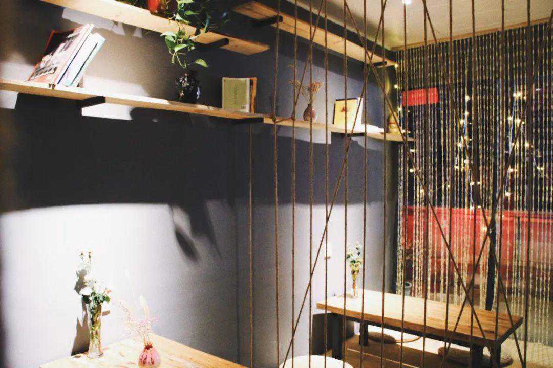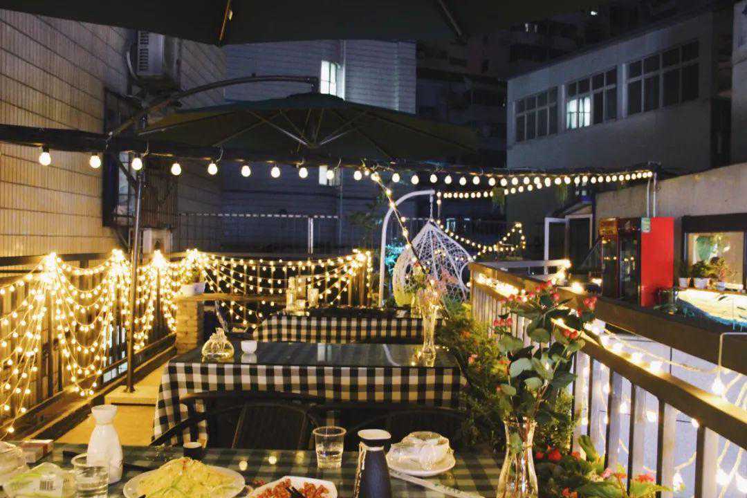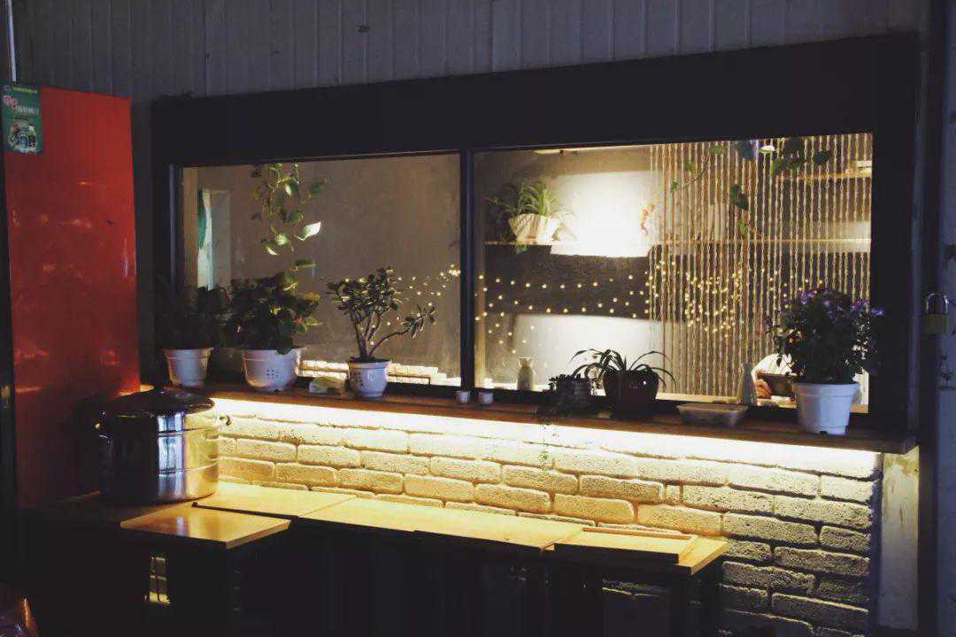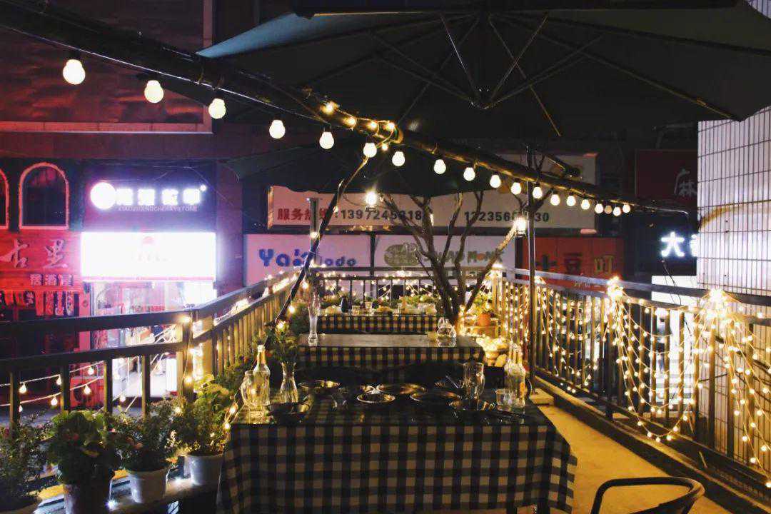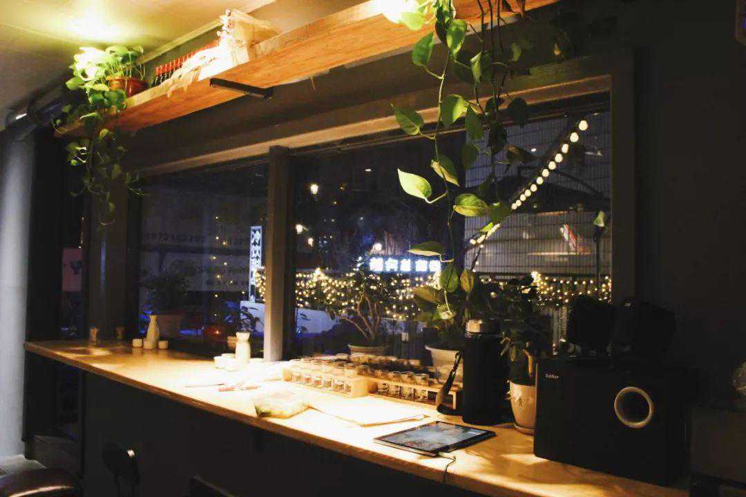 老板跟他的朋友,同我和花花一样从上学相识,至今二十多年,他们都很喜欢花花草草。当时在盘下店面的时候,旁边的阳台其实是荒废的,后来自己焊了栏杆,种了植物,摆上了桌子和吊篮又挂了吊灯,倒显得分外有情调。