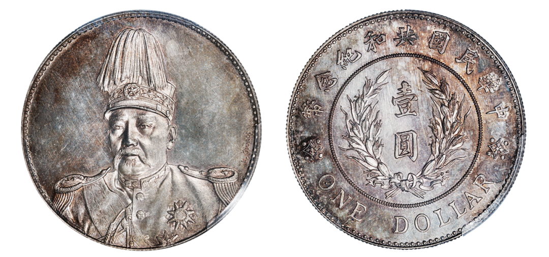 另一枚1914年袁世凯戎装像中华民国共和纪念壹圆银币样币同样难得。在袁世凯正式就任民国大总统后的次年(1914年),天津造币总厂意大利籍雕刻师乔奇镌模发行了“共和纪念币”壹圆银币。其正面为袁世凯着戎装、头戴高帽的七分侧面像;背面内圈为嘉禾二本,左右交互,下萦结带,中镌“壹圆”二字,外缘上方刻“中华民国共和纪念币”九字,底部则为英文ONEDOLLAR。另有正面人像右下肩处镂刻缩写的签字版。