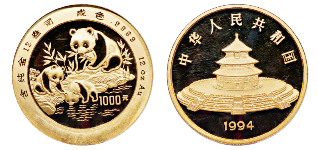 1994版熊猫金银铂及双金属纪念币(12盎司圆形金质纪念币)精制,直径7厘米,成色99.99%,面额1000元,最大发行量99枚。NGCPF69/评级编号3955342-001