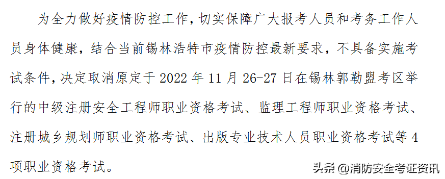 根据当前锡林郭勒盟疫情防控有关要求,不具备考试条件,决定取消原定于2022年11月26-27日举行的2022年监理工程师、中级注册安全工程师等在内的4项资格考试。