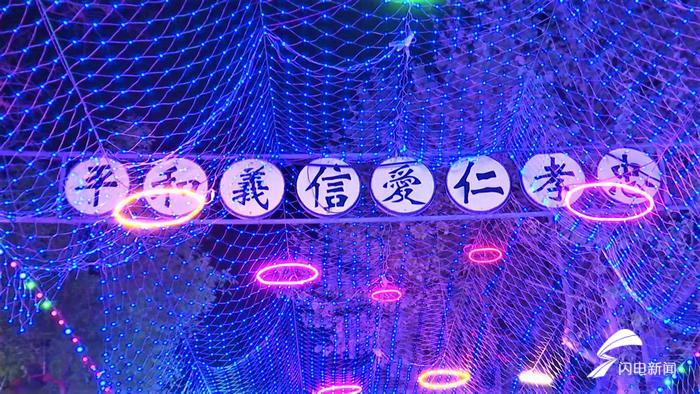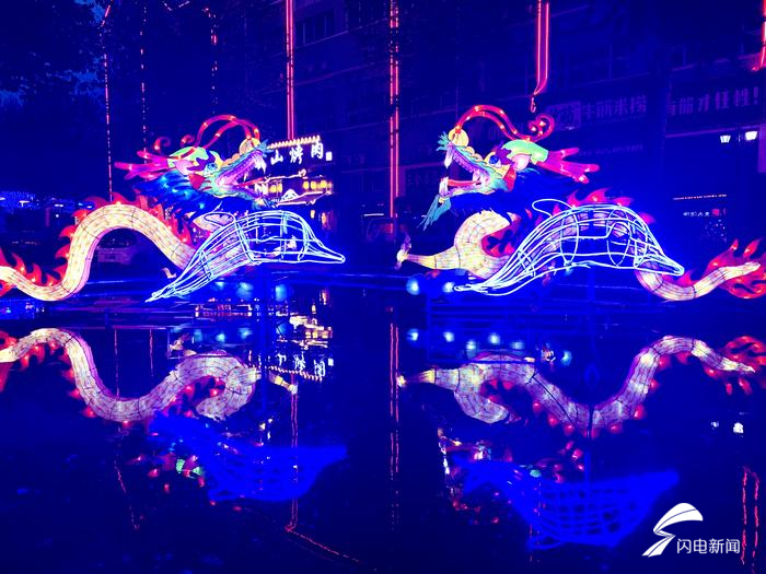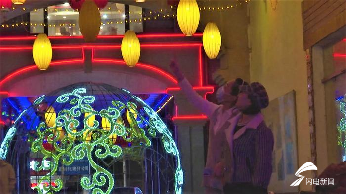 “灯光秀以蓝色为主题,蓝色灯幕下悬挂了各种颜色的许愿环,亮灯时间是18:30到22:00,主要布置在园区的东侧主道,长度为200米,宽度是6.5米,另外在水池旁也安放了不同场景的花灯。”山东新街口文化产业有限公司物业经理李凤茹告诉记者,灯光秀吸引了许多人前来参观、拍照、就餐,为市民营造一个浪漫的就餐环境,助力餐饮商户复工复产。