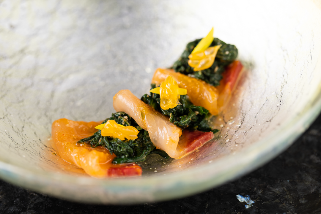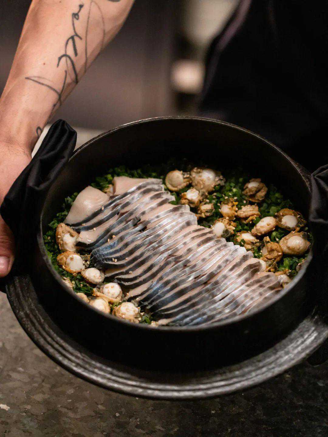 鰤鱼,是韩国人冬天必吃的食材,也是Tom最喜欢的食材之一,甚至在他的手臂上也有鰤鱼的纹身。经过大酱调味的生鱼片,搭配韩国苏子叶与些许酸甜的橘子,吃到丰腴鱼肉的同时,味道清新又开胃。