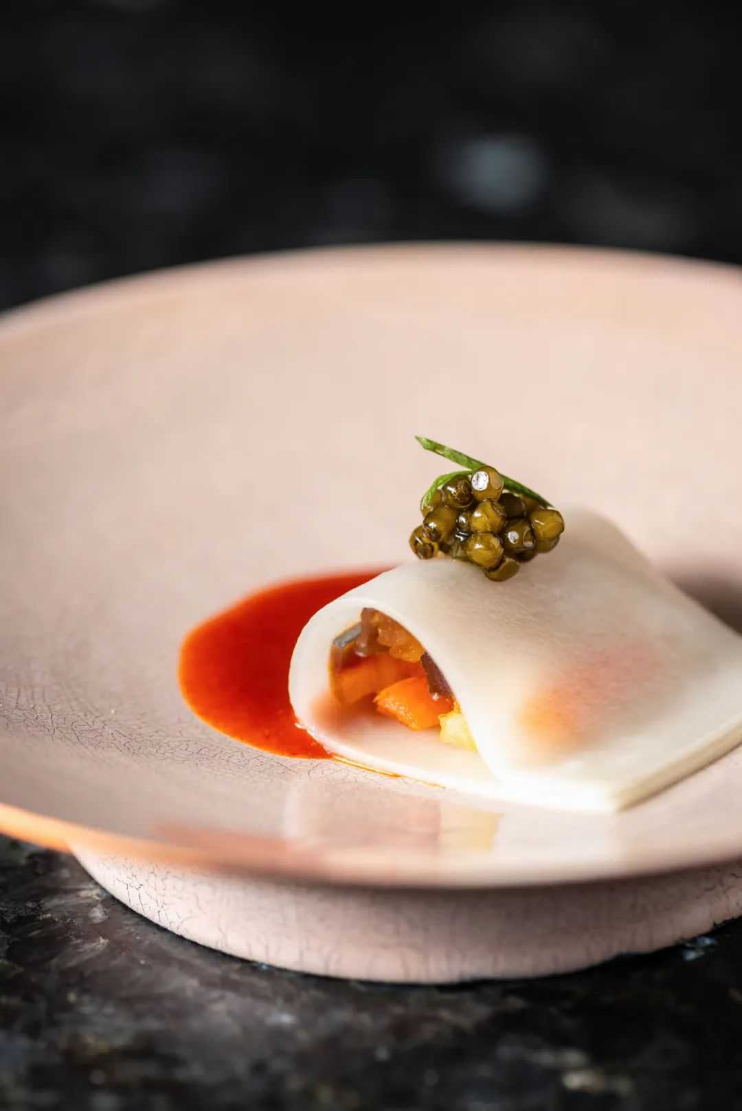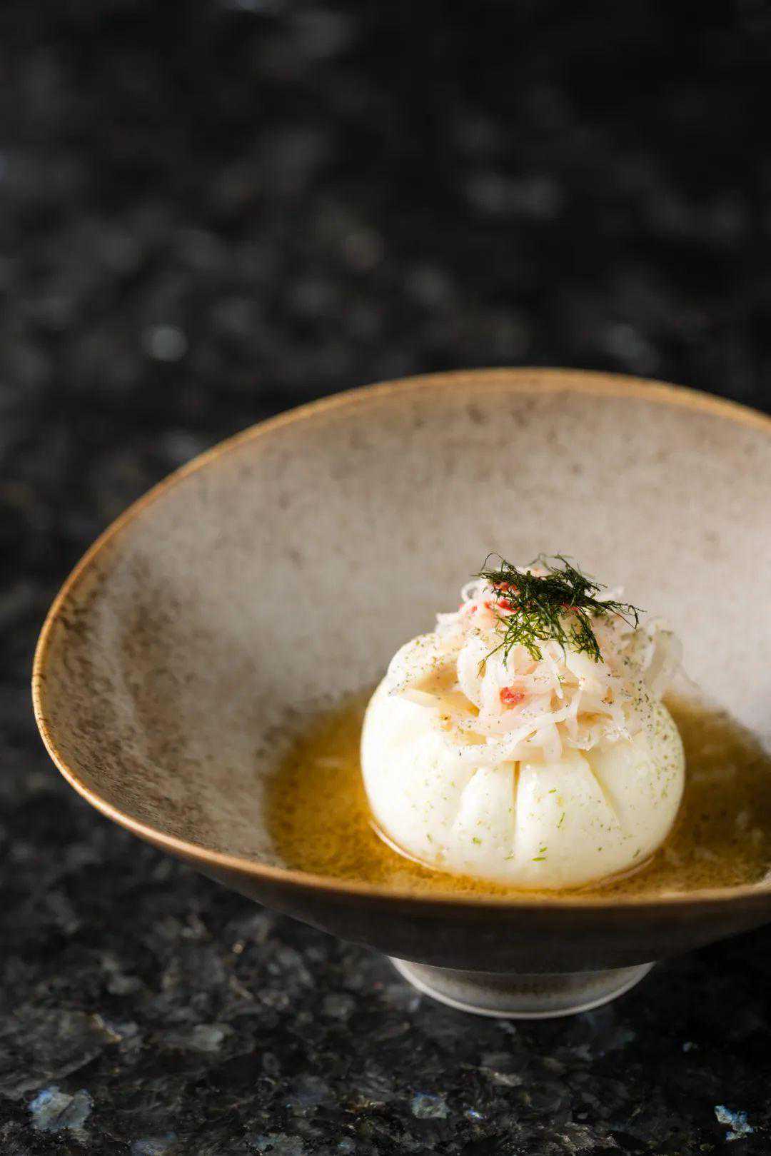 夹着秋刀鱼干的手工土豆面片,沾一些辣度鲜明的自制辣椒酱,口感像在吃韩式年糕,颇有特色。以雪蟹肉和蟹膏酱搭配内里流心的鸡蛋,更是不用太多调味便是至味。