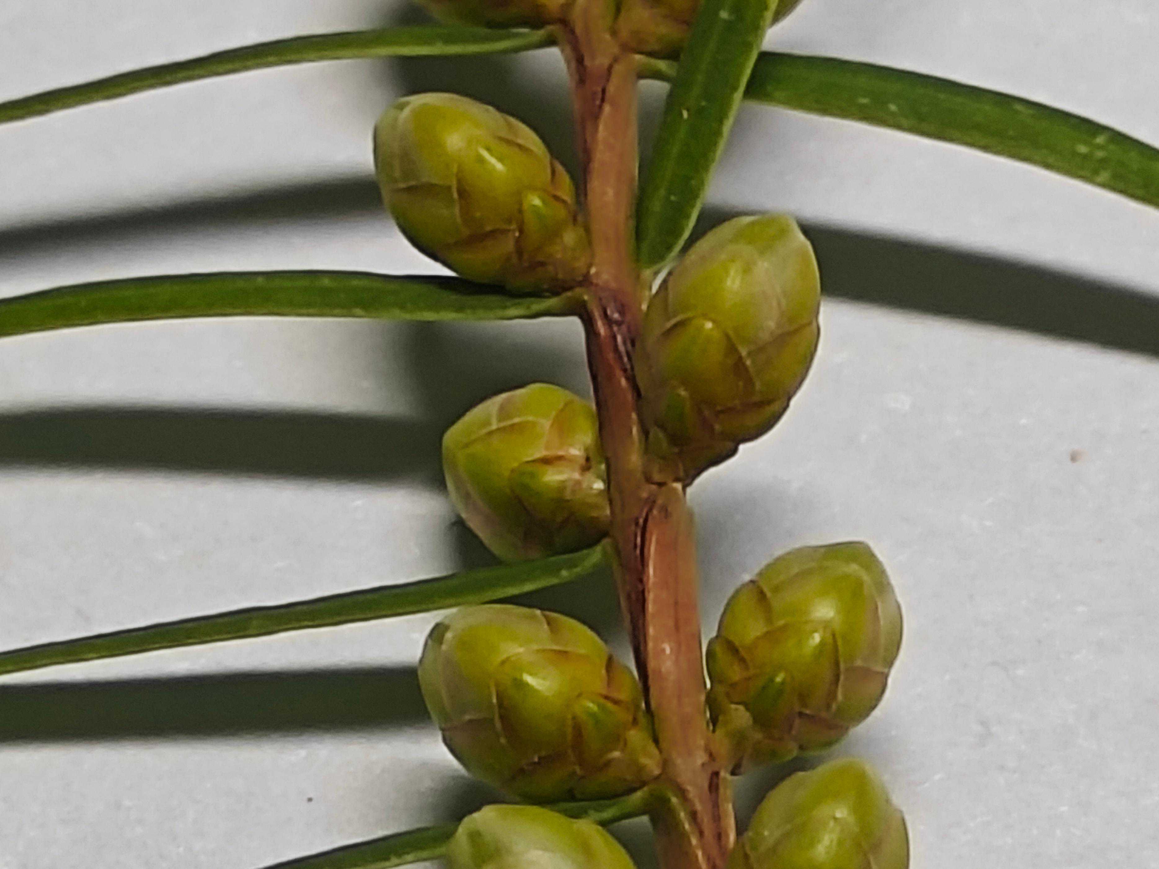 每个雄球花大米粒般大小,再细小的我看不清楚了,查资料说它的雄蕊约20枚,每个雄蕊有花药3枚,药隔显著,花粉粒无翅。