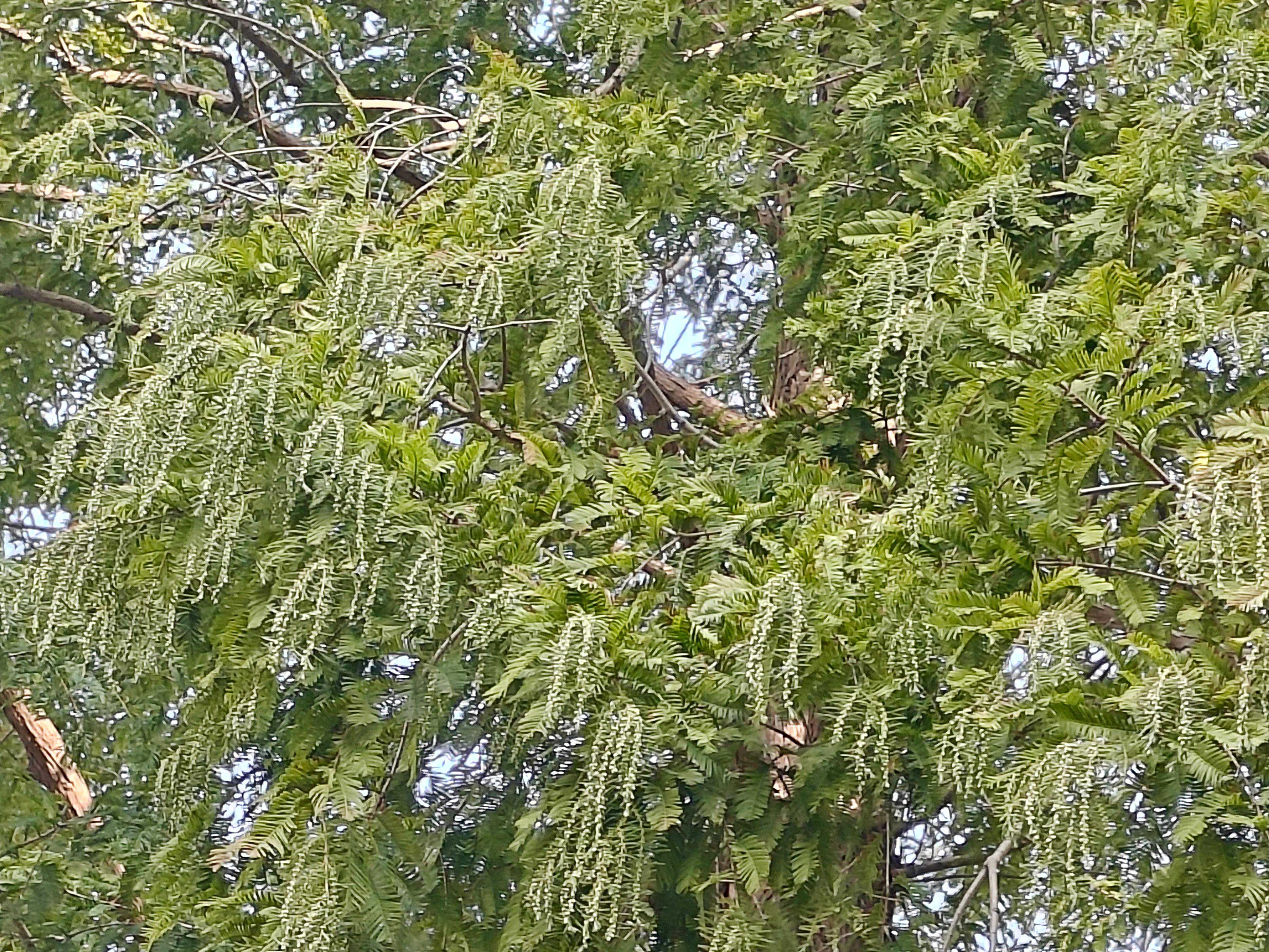 国庆节前夕,有一天妻子告诉我水杉开花了,并给我发了照片。我跑去一看,原来是有两棵树长满了雄球花序,当初只顾看球果了,竟然没有看到。