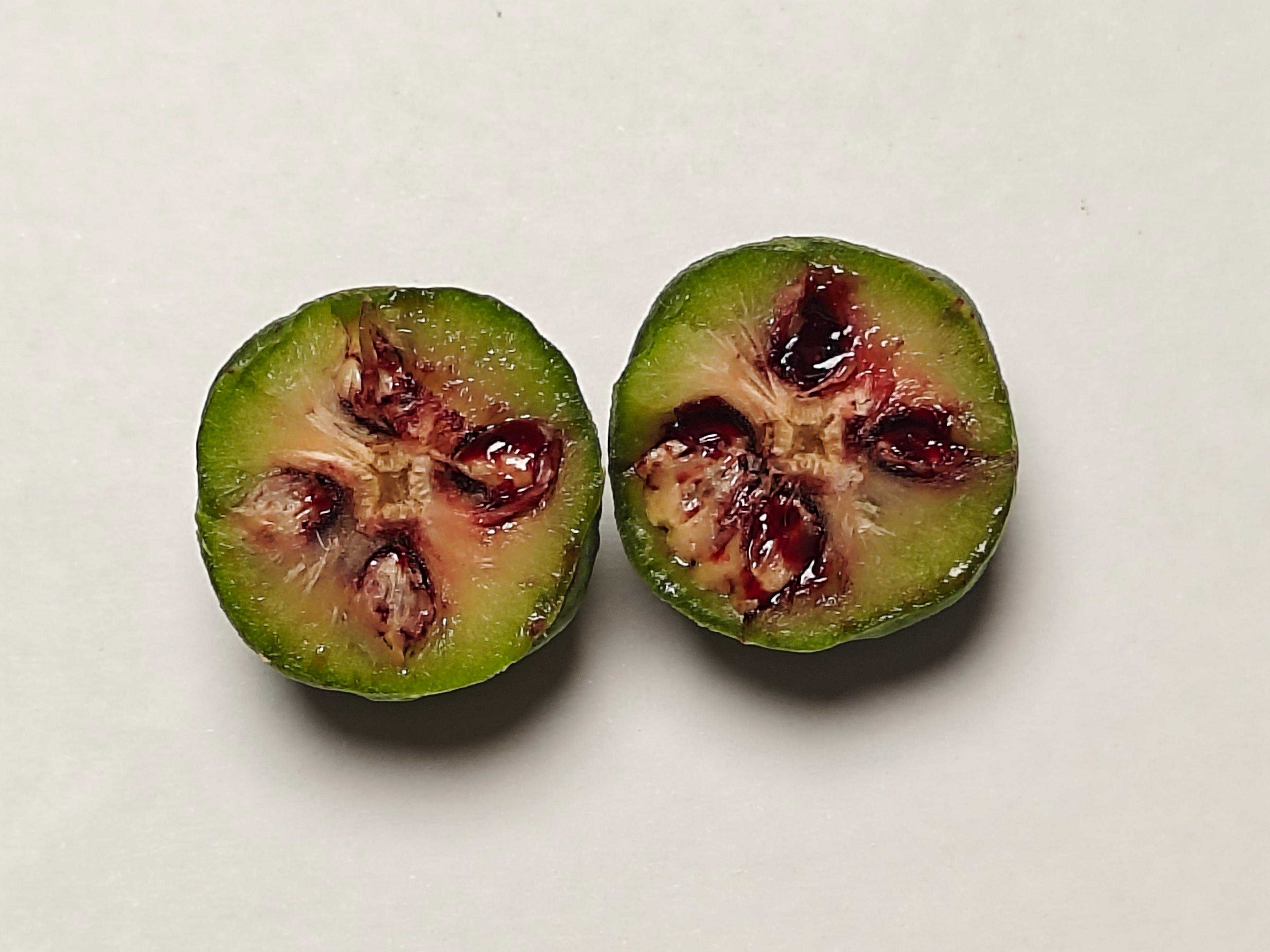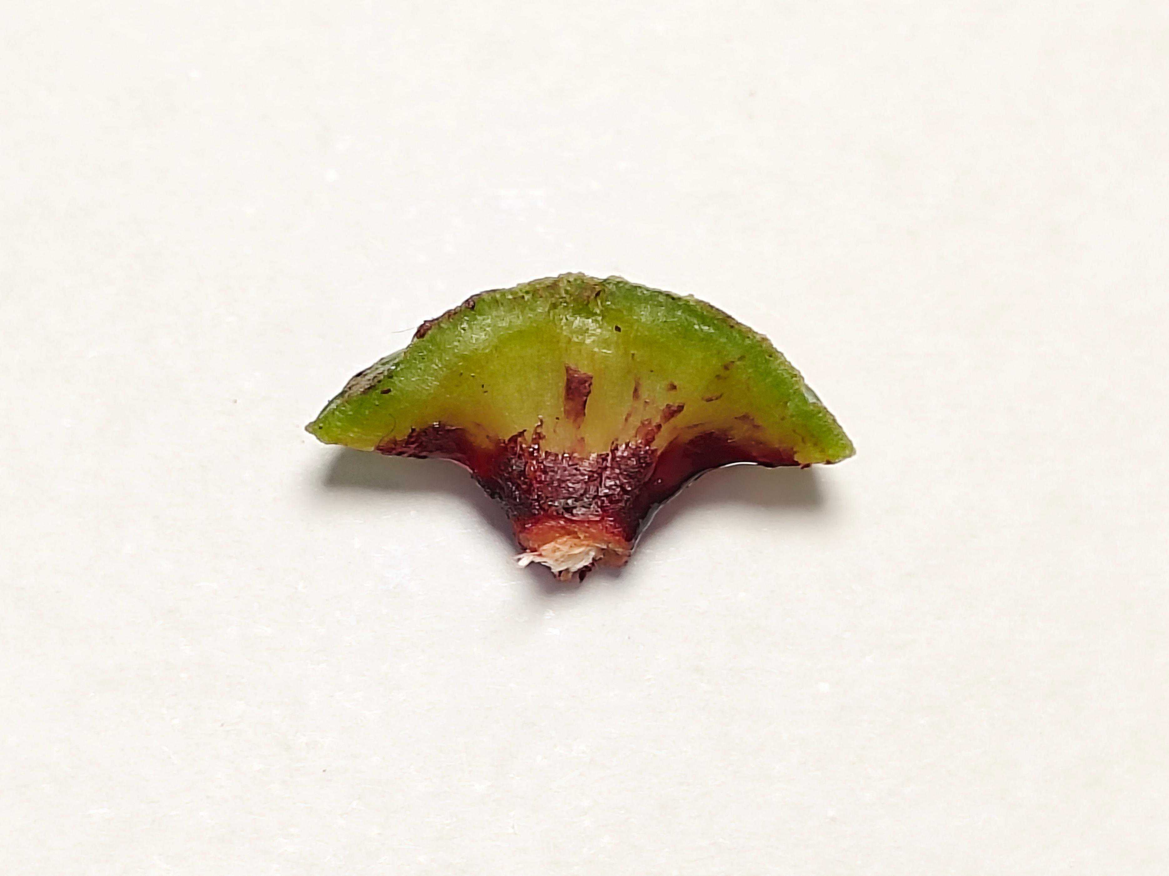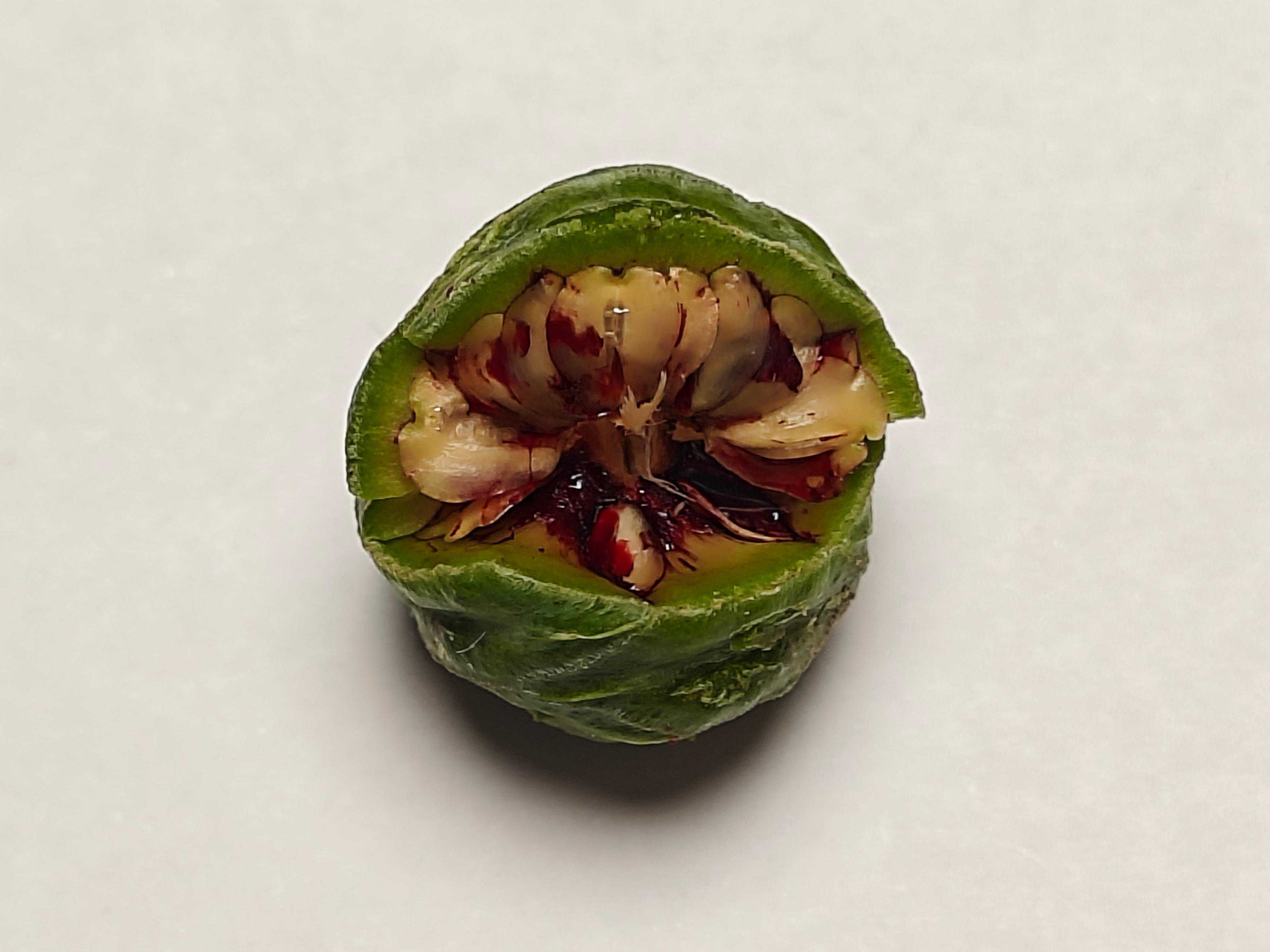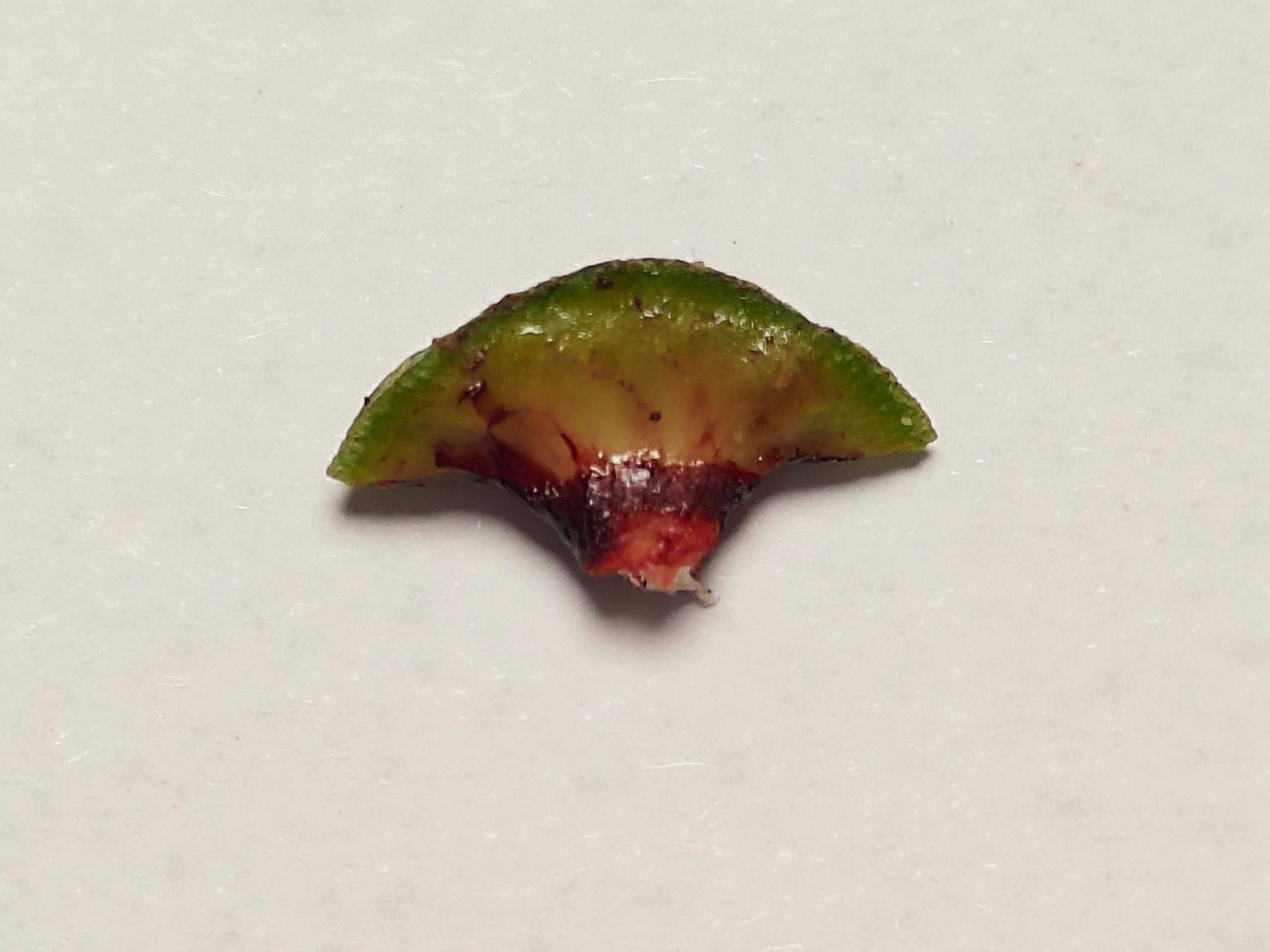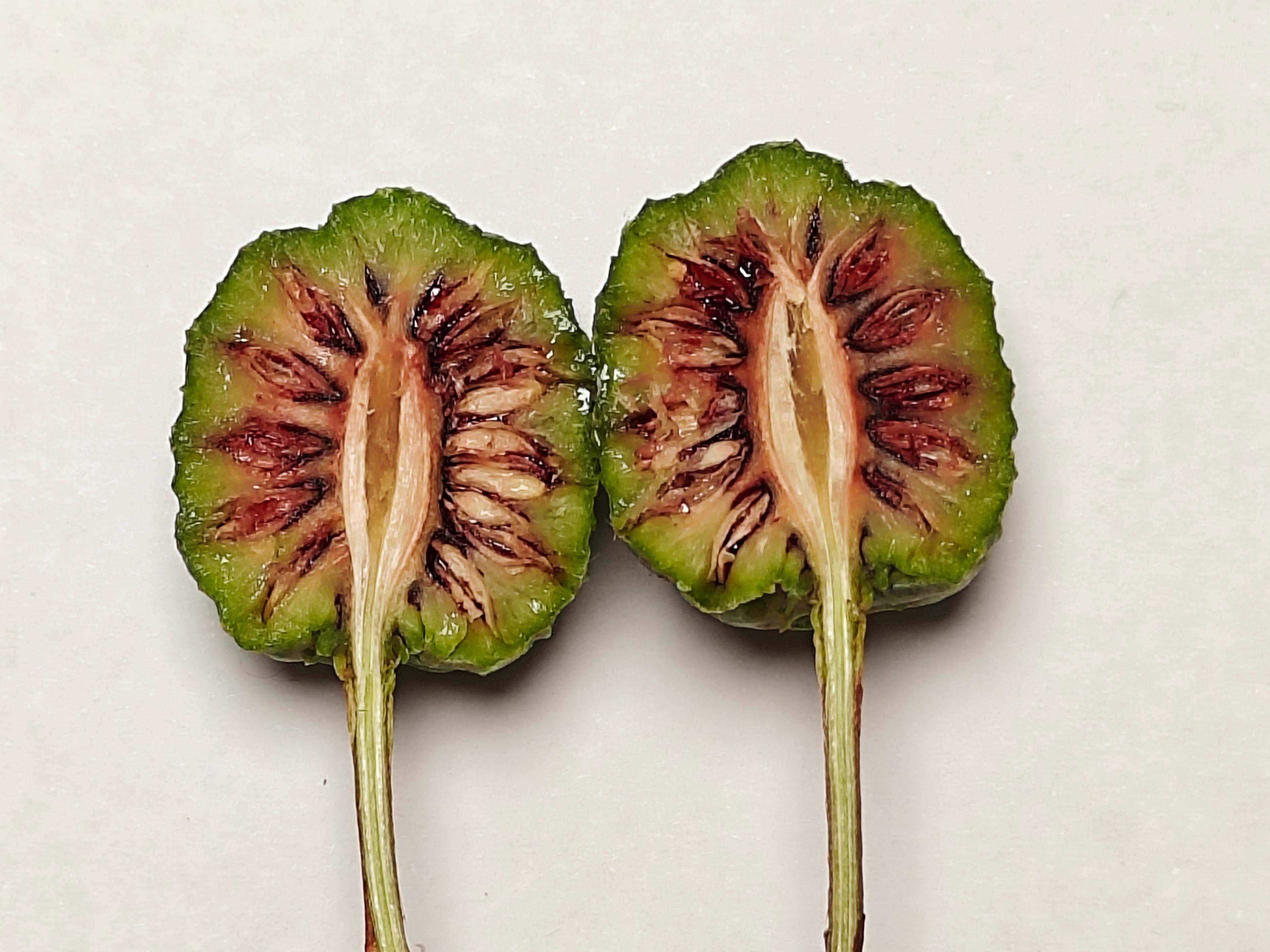 我用小刀先将它进行横切,这时候它的种鳞已经木质化了,很坚硬,用力切开之后,发现有4列种子,种子周围充斥着粘稠的液体,殷红如血。我想这4列种子应该就对应着它的“四棱”吧。