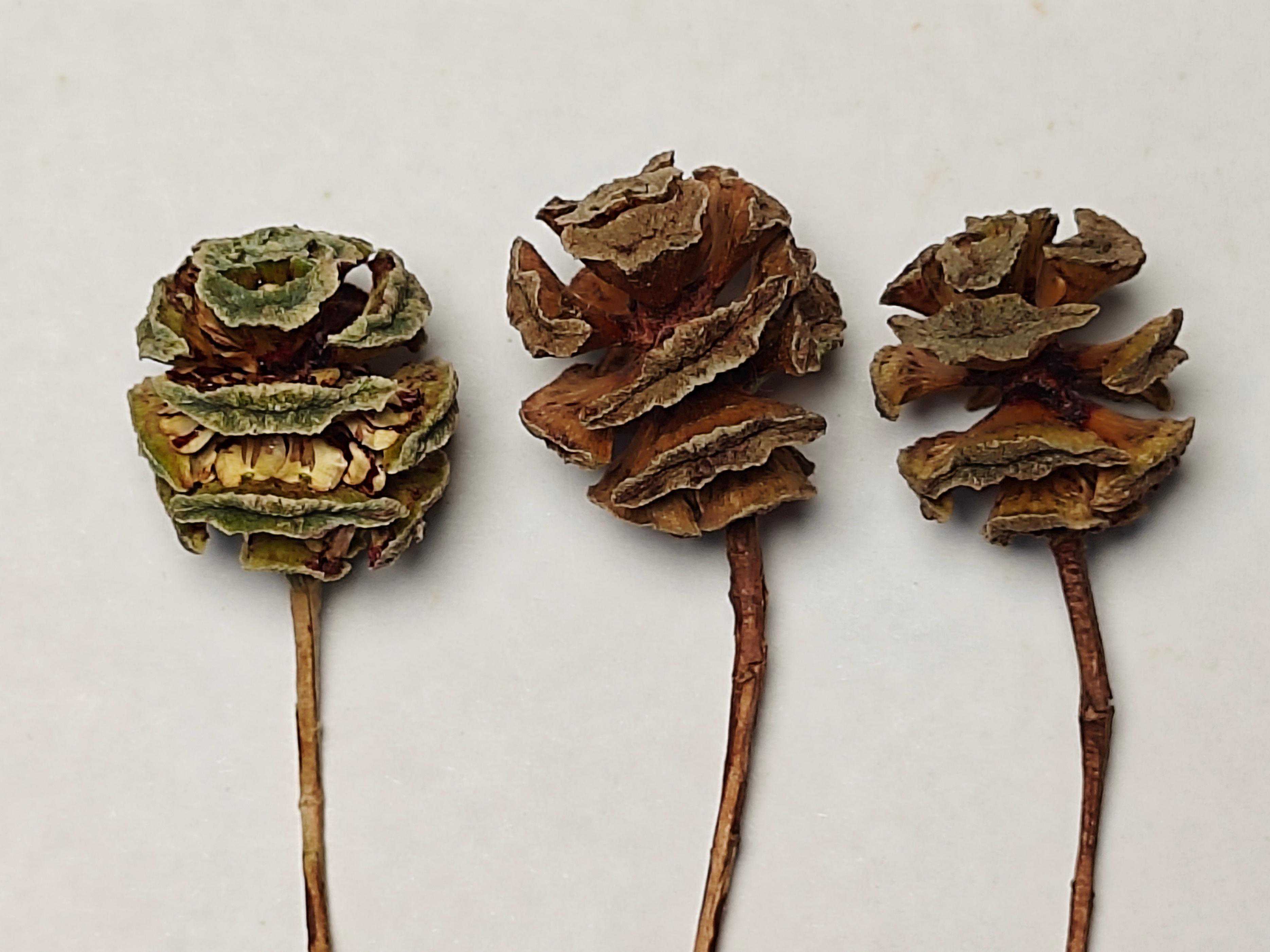 下面这张照片上的球果,右边两个是在莱阳农学院捡的种鳞张开种子散发后的,左边那个是在化龙初中打下的未成熟的干燥后开裂的。