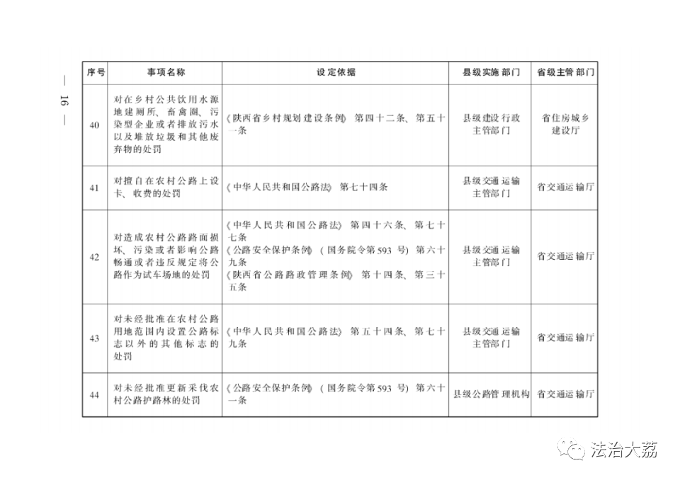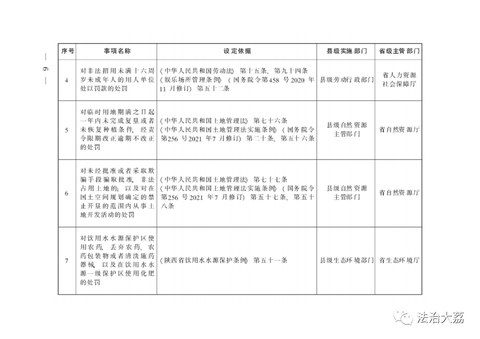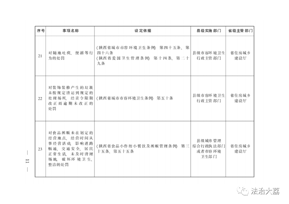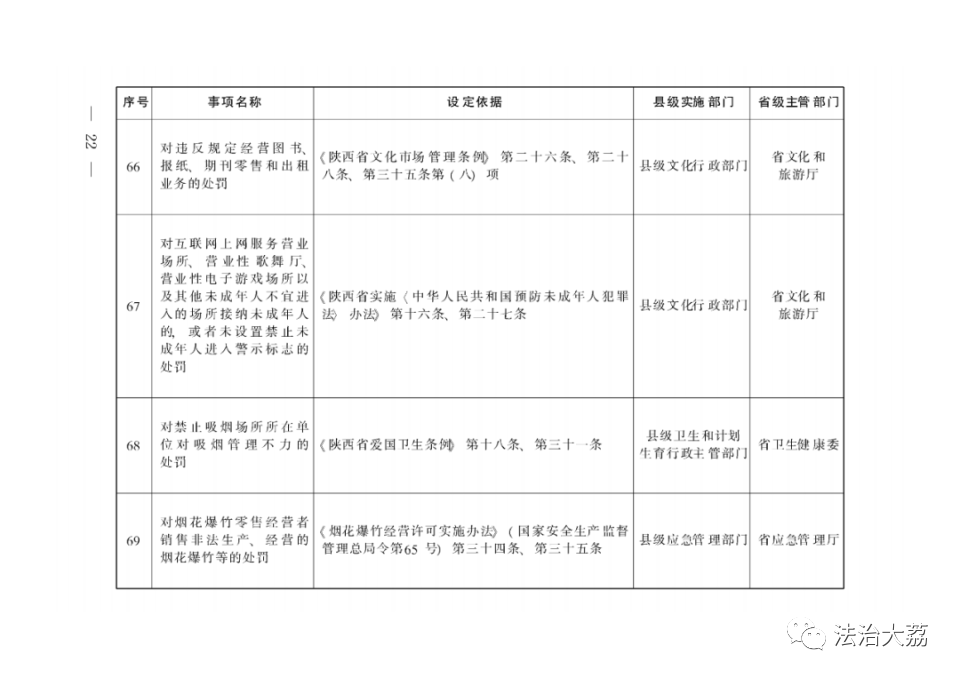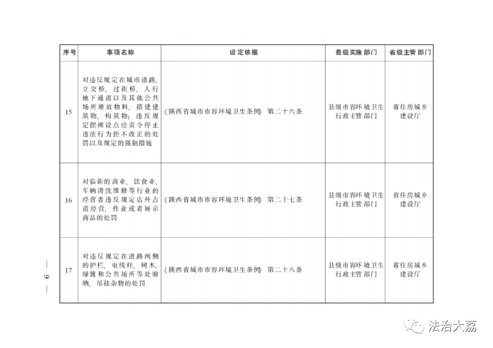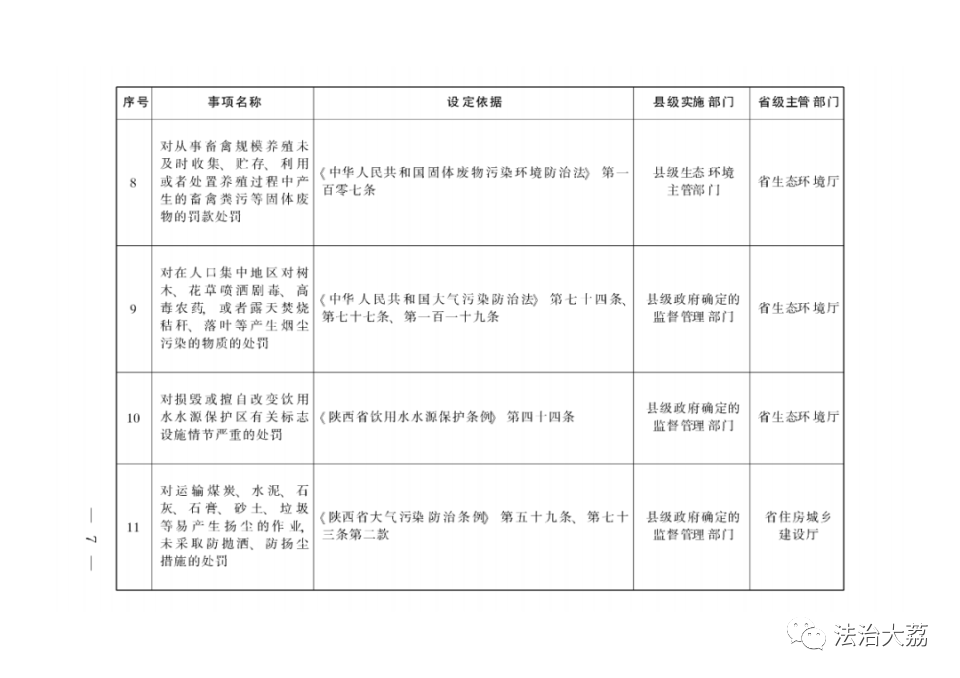 依据有关法律法规规定,省政府制定《陕西省下放乡镇人民政府和街道办事处行政执法事项指导目录》(以下简称《指导目录》),将直接面向人民群众、量大面广、由基层管理服务更方便有效的部分县级政府部门行政执法权下放至乡镇(街道)。