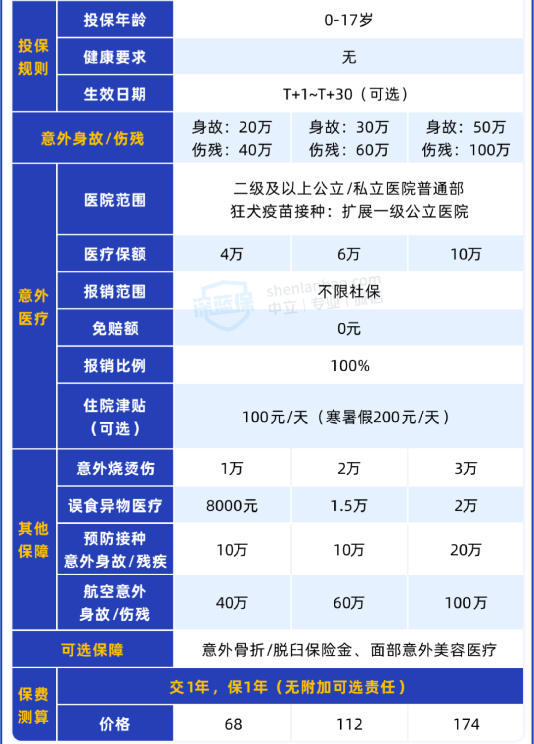 但如果想追求更好的就医体验,到二级及以上公立医院特需部、国际部,以及指定私立医院就诊,可以考虑给孩子买专心少儿意外险2023(尊享版),由美亚财险承保,也是一款性价比不错的少儿意外险,最低200块就能买到。