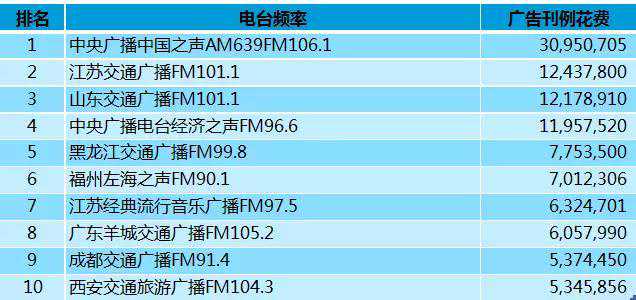 4、电台媒体的广告刊例,以交通、新闻、音乐类为主,中央广播中国之声、江苏交通广播、山东交通广播排前三。