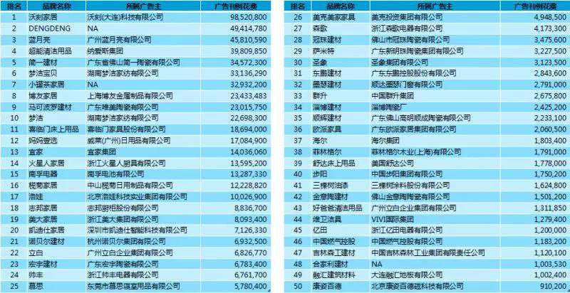 最近有个“沪深100”的机构给出了一份榜单,它统计了2018上半年中国大消费类公司广告效益TOP100,里面出现了不少家居公司。