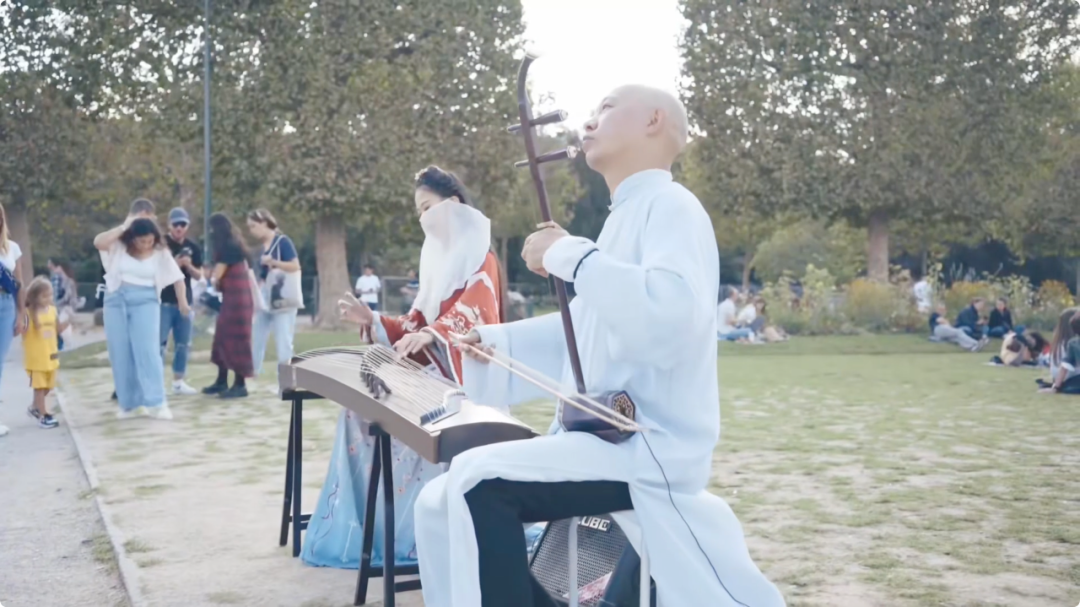 留学生@碰碰彭碰彭在法国街头用古筝演奏《我的中国心》。