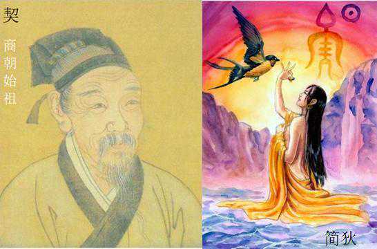 这个传说的故事是,帝喾有个妃子称为简狄,有次在洗澡时祈祷让她怀上帝喾的孩子,上苍听到了她的话,就派一支燕子从天而降,把一枚燕卵给这个妃子,说:“你把它吃了,回去后就可以怀上帝喾的孩子了”。果不其然,随后契就诞生了。帝喾在契长大后,给了他一块封地。契和家臣的后代在那里形成了商族,直到十四世后成汤(商太祖)夺到了天下,建立了商王明。