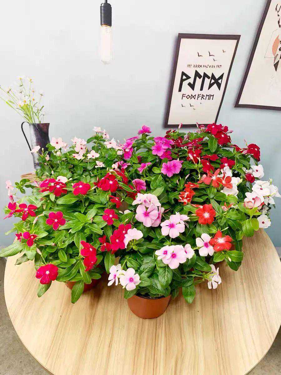 长春花又叫日日新、四时春、天天开等,它是植物界有名的“开花机器”,是一款全年都能开花的植物,也是一种很受大家喜爱的观赏盆花。它园艺品种繁多,株形紧凑丰满,枝繁叶茂,膜质的叶片翠绿光亮,叶脉清晰可见,一朵朵清丽可爱的花朵落落大方,花色绮丽多彩,观赏价值极高。家里养上几盆,靓丽缤纷的花朵给人一种欣欣向荣、朝气蓬勃的感觉,繁花满枝,如锦似绣,韵味十足。