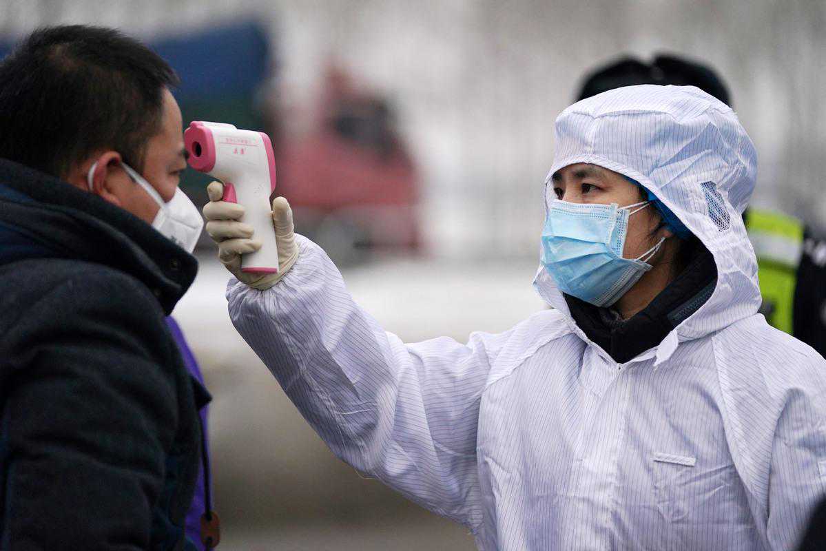 Astaffworkertakesaman'stemperatureatanexpresswayexitinHarbin,capitalofHeilongjiangprovince,onFeb21,2020.[Photo/Xinhua]