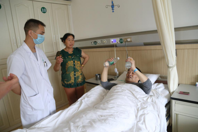 阳医生不仅治疗患者的身体疾病,他对患者的心理健康也非常重视。他发现患者因为瘫痪多年,健康的上肢因为长期不运动造成肌力下降,对锻炼也缺乏兴趣,于是阳医生一有空就去病房跟他扳手腕。当患者输了时,阳医生塞给他两个装满水的矿泉水瓶,“每天举这两个瓶子半个小时,说不定下次就能扳过我了。”在阳医生的激励下,患者也开始主动锻炼。通过锻炼,上肢肌力慢慢提高,消化功能也渐渐好转,胃口越来越好。天气晴好时,阳医生只要有空就用轮椅推着患者去医院的庭院里转转,陪他聊聊天。在阳医生的悉心照顾下,患者心情越来越开朗,身体状况更是得到了很大改善。