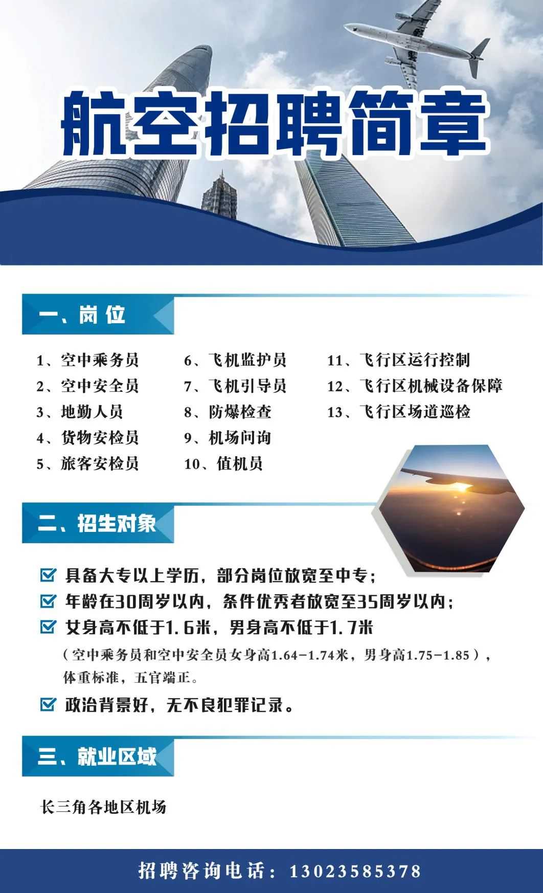 今日开始,长三角地区航空业就业项目,在如东启动适龄人员招聘。一、招聘对象1.中专以上学历,大专以上优先录取;2.25周岁以内,部分岗位放宽至35周岁;3.女性身高不低于160厘米,男性身高不低于170......