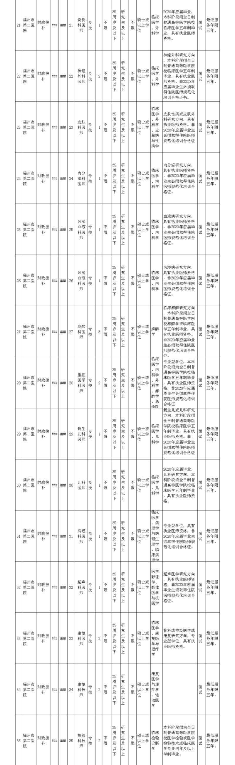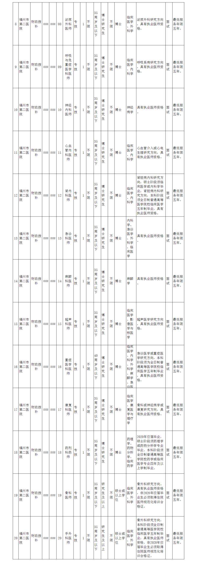 本次招聘职位为福州市第二医院工作人员,共计划招聘120名,招聘职位、招聘人数、职位资格条件等详见文末附件《2020年福州市第二医院单位公开招聘工作人员岗位信息表》(下简称《岗位信息表》)。