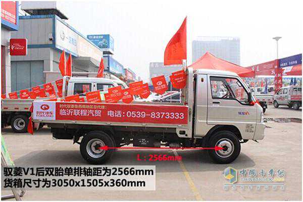 驭菱V1平板货箱尺寸为3050x1505x360mm,后双胎,轴距为2566mm,超长轴距重载不翘头、操控行驶更稳定。