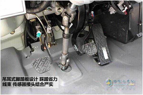 该车脚踏板采用吊耳式设计,驾驶员踩踏角度合理,省力!底部线束和传感器接头做工严实,可靠性提升。