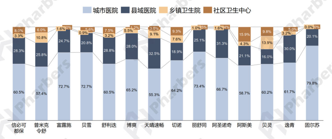 从头部产品的渠道分布来看,广阔市场渠道总体贡献较高的产品有抗哮喘和COPD药天晴速畅(县域医院较高)、咳嗽和感冒制剂阿斯美(社区卫生中心较高)、抗哮喘和COPD药普米克令舒(乡镇卫生院较高)。而核心市场(城市医院)占比较高的头部产品主要有其他呼吸系统药固尔苏、抗哮喘和COPD药丽舒同、咳嗽和感冒制剂富露施以及全身抗组胺药贝雪(图4)。