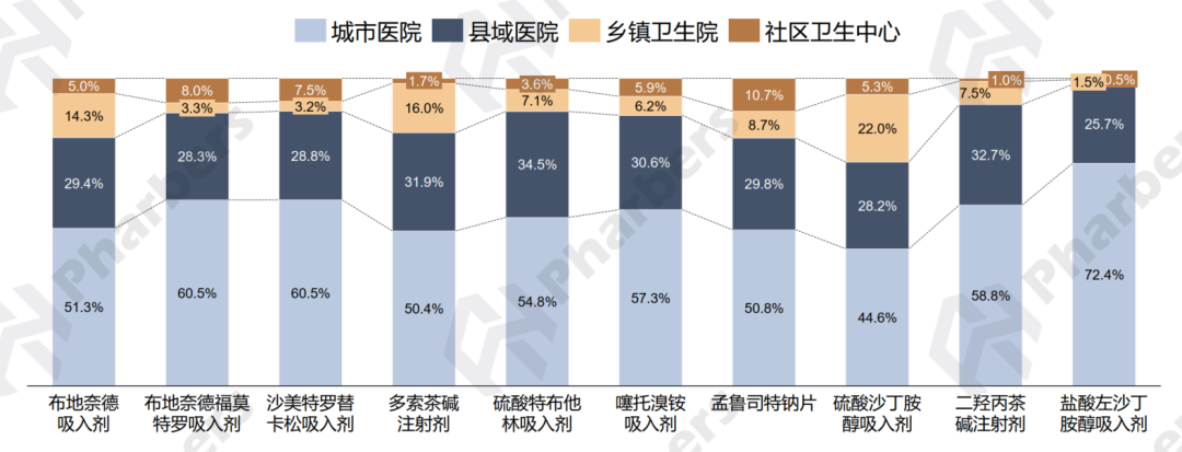 从抗哮喘和COPD药头部品种的渠道分布来看,广阔市场(除城市医院外)规模占比较高的主要有硫酸沙丁胺醇吸入剂、布地奈德吸入剂和多索茶碱注射剂,这三个品种的乡镇卫生院渠道贡献度均远高于细分市场的平均水平(10.1%)。另外,县域医院渠道占比较高的还有硫酸特布他林吸入剂、二羟丙茶碱注射剂等,贡献度均高于30%;孟鲁司特钠片、布地奈德福莫特罗吸入剂在社区卫生中心贡献度位列前二;盐酸左沙丁胺醇吸入剂则为城市医院渠道贡献度较高(图3)。