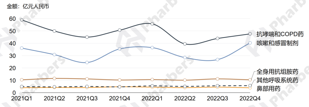 图2-呼吸系统用药分类及总体医疗机构销售额季度变化