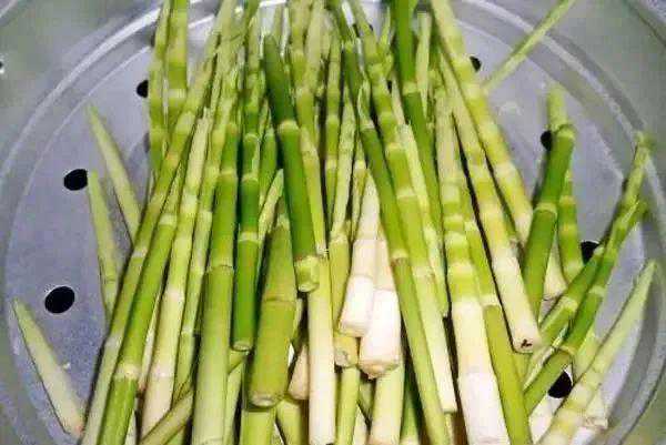 蕨菜,它的叶缘向内卷曲,叶柄细嫩时有细绒毛,草质化后茎秆光滑,茸毛消失。它喜欢湿润、凉爽的地方,小河边也是它生长地之一。它的叶芽、嫩茎营养丰富,富含人体需要的多种维生素,根茎还可供药用,具有清热、滑肠、降气、化痰、治食嗝、气嗝、肠风热毒、舒筋活络等功效。