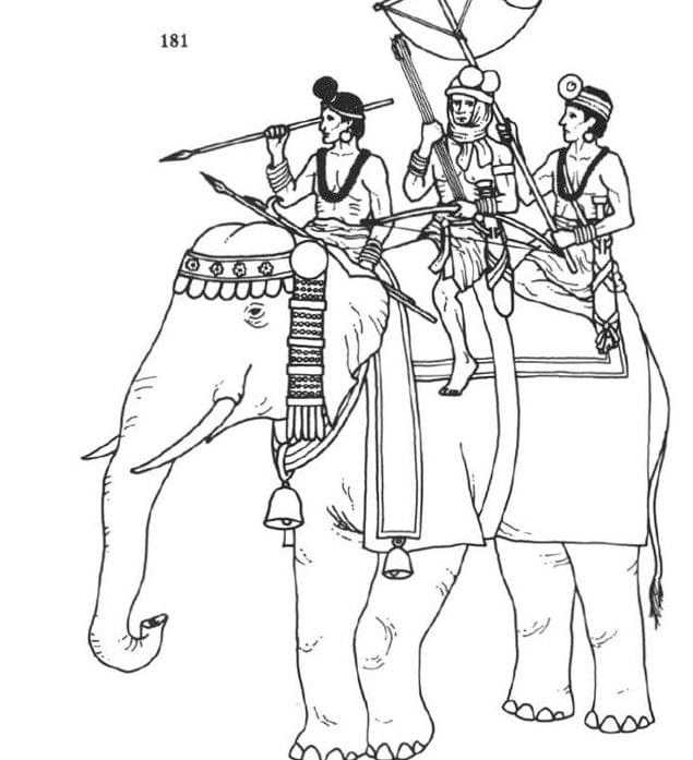 印度的战象没有后来常见的橹,也就是作战平台,那东西是后继者战争末期发明的,这也是亚历山大一片最大的失误,一个战象上通常有三人,一人手持象戟,两人投标枪,也有的战象只一名战士,另一人举旗或撑伞