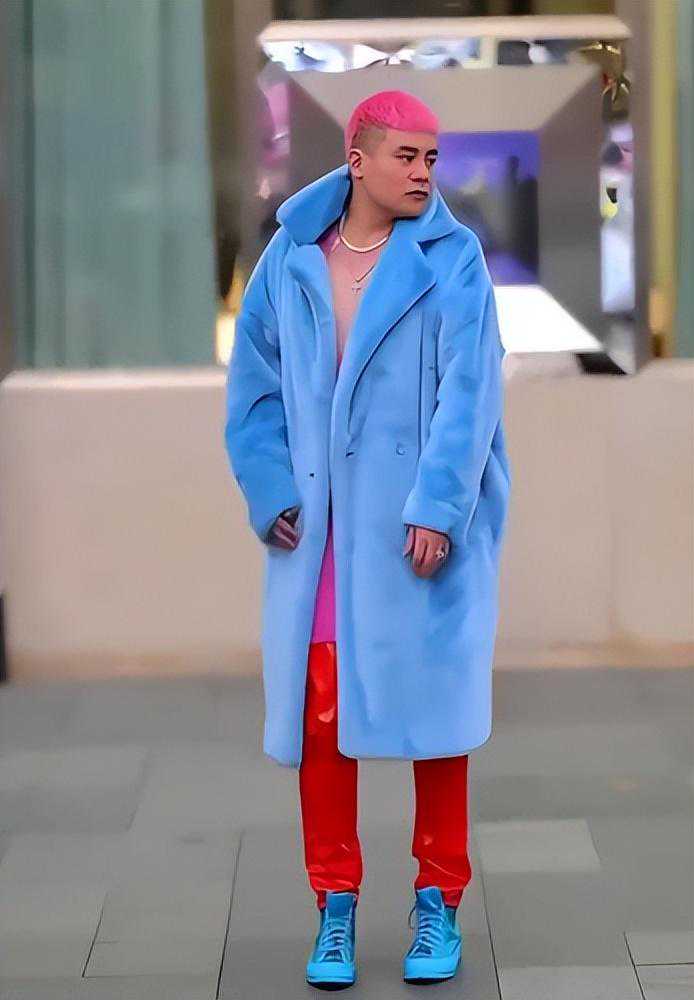 还有更加惊为天人的,蓝色加绒外套里面搭配深V玫红色吊带,下面再配个亮红色的屁股,把调色盘玩得明明白白,性别颠倒~