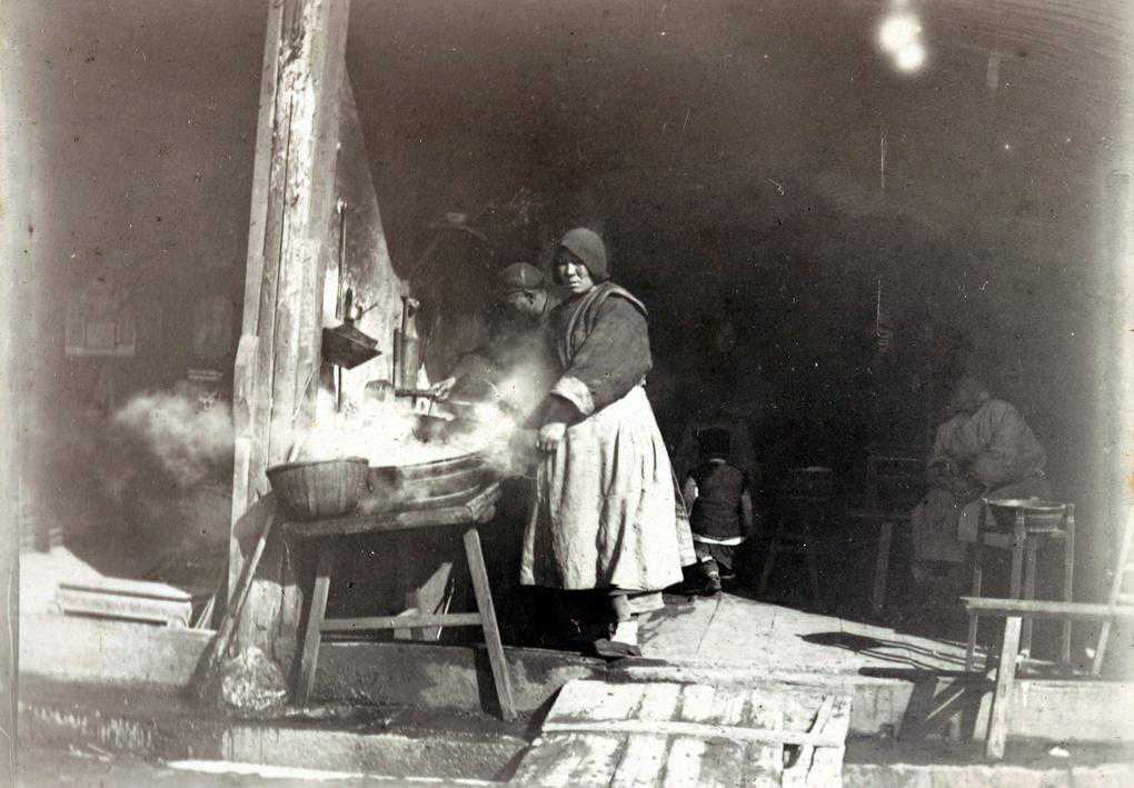 1900年上海苏州河附近的卖坛商店和甜栗子摊位。