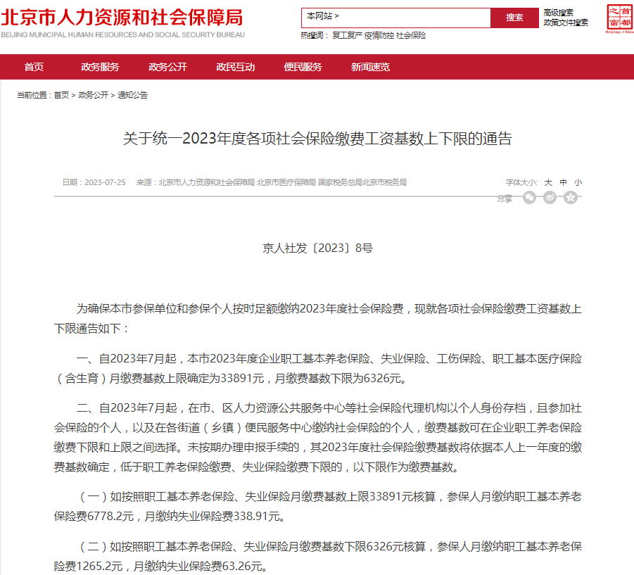 一、自2023年7月起,本市2023年度企业职工基本养老保险、失业保险、工伤保险、职工基本医疗保险(含生育)月缴费基数上限确定为33891元,月缴费基数下限为6326元。