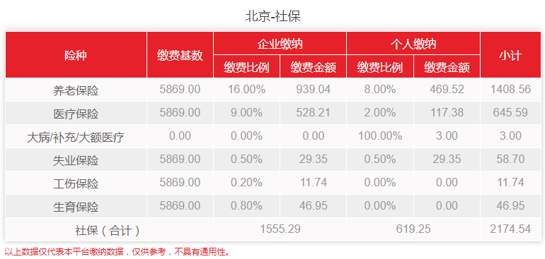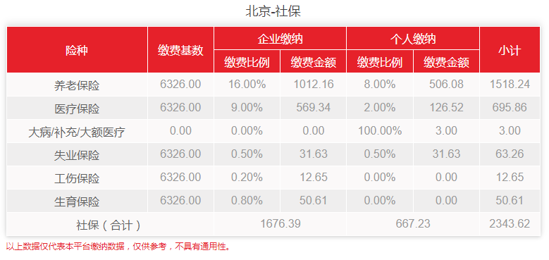总结:如果按照最低社保缴纳基数6326元/月计算,北京最新社保费用是2343.62元,其中公司需要缴纳的费用是1676.39元,个人需要缴纳的部分是667.23元,相比较还没调基之前社保费一共是增加了169.08元,个人部分增加了47.98元;
