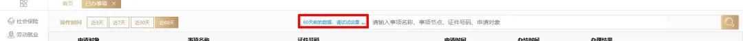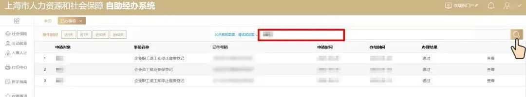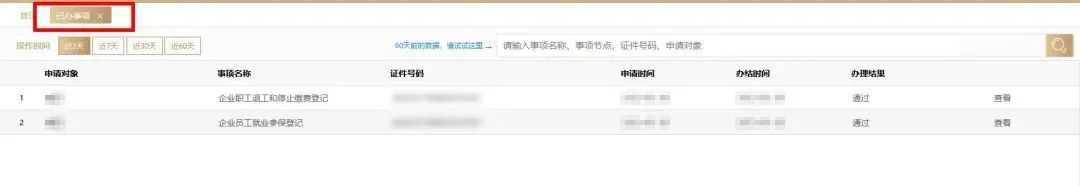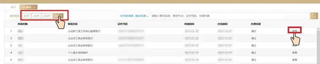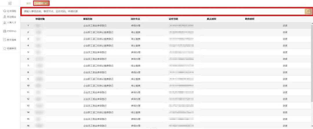 通过搜索框录入“事项名称”、“证件号码”等,可进行更精准的检索。