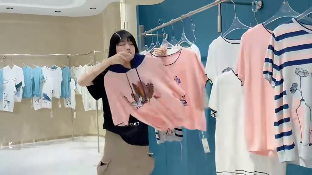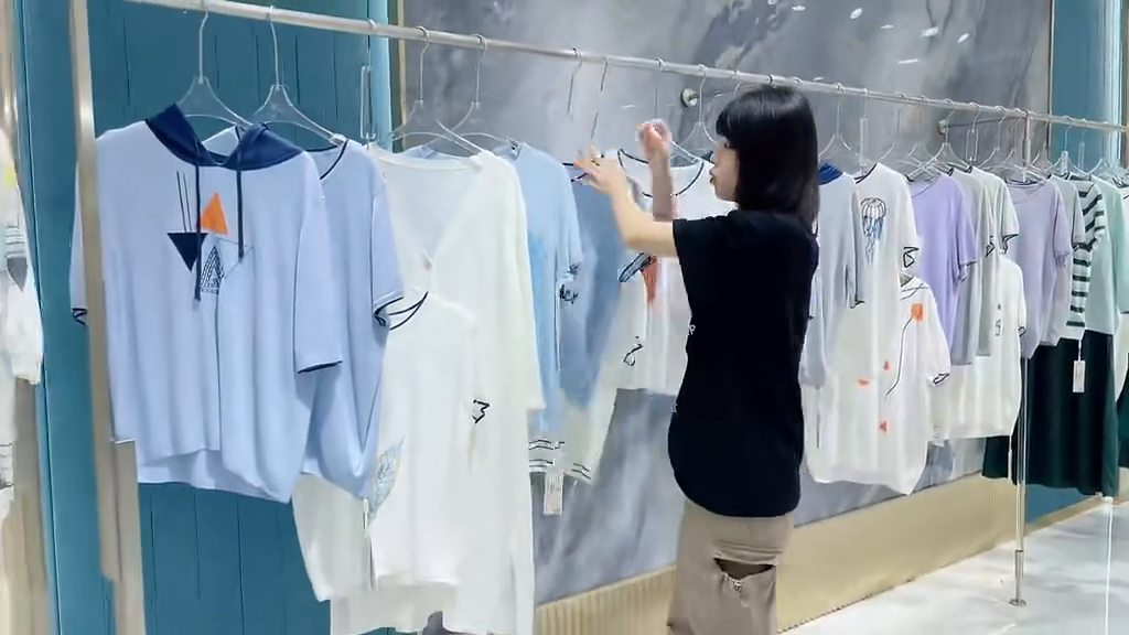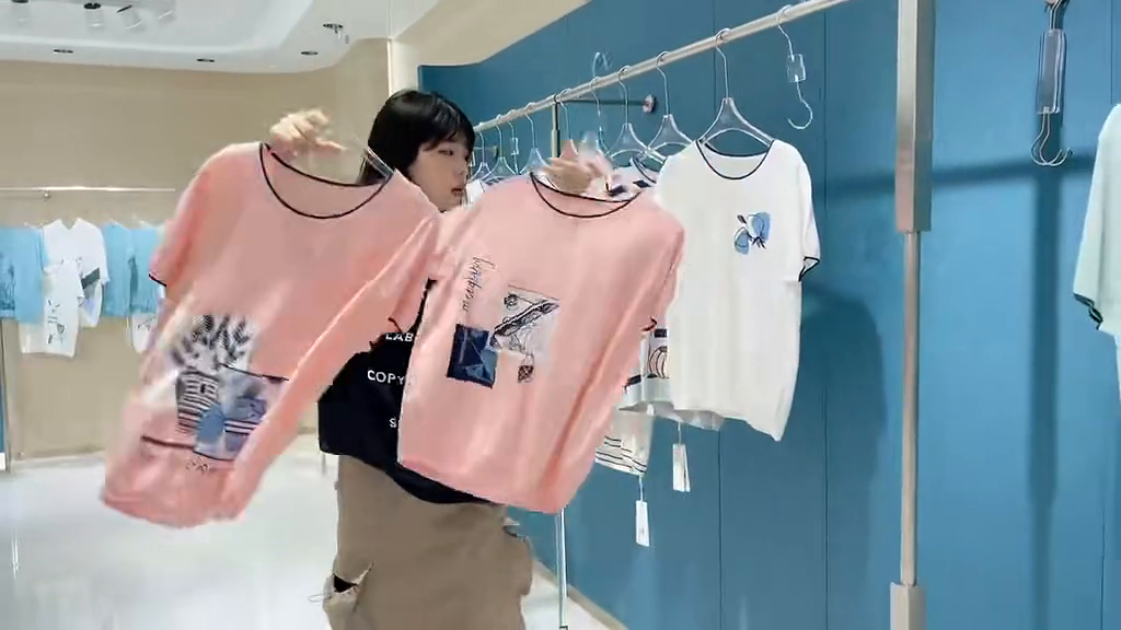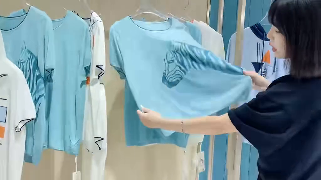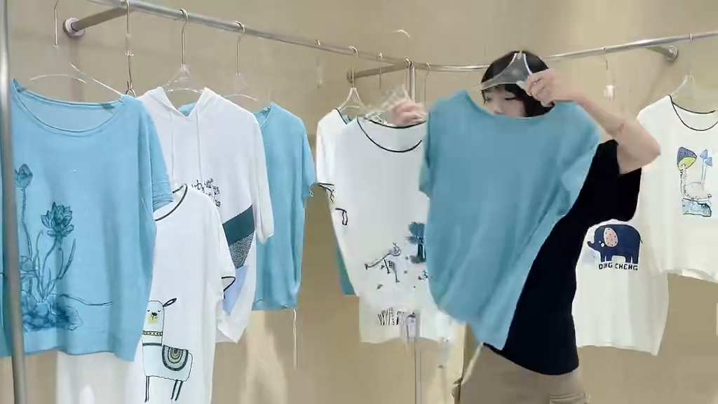 里面分为连帽款跟圆领款式,包括像这种绿色以及这种天蓝色都是这种低饱和度的颜色,不会很亮眼、不会很抢眼的那种。而且尤其是夏天,夏天的衣服千万不要穿那种款式很花的感觉,那种一看就感觉很热,尤其是像这种比较简单的上衣t恤就给人一种很清凉的感觉,再加上它的面料整体的质感,保证大家能赚到钱的一批货品,库存不多,赶快去联系自己的销售经理。