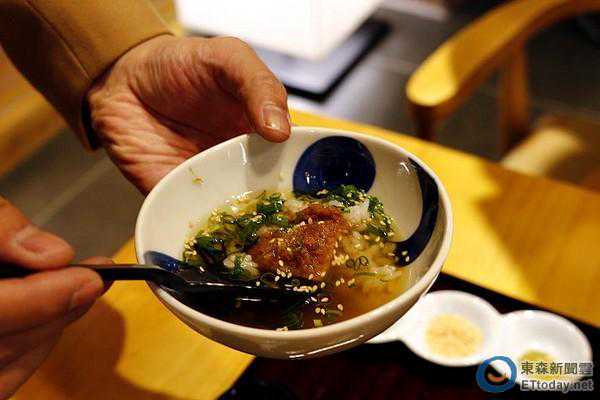 店内另一大招牌,同时也是迈泉猪排独家提供的炸猪排套餐方式,就是「猪排三部曲」。第一口先吃原味的猪排与米饭,接着放入随套餐附上的葱、芝麻与芥末3种配料,可吃出另一种层次感,最后淋上高汤,以茶泡饭的形式品味,高汤清淡并没有过多的调味,因此可吃出清爽滋味,如果加入芥末,还能品出微呛的辣感;该套餐更贴心的将猪排切成许多小块,方便客人品尝。