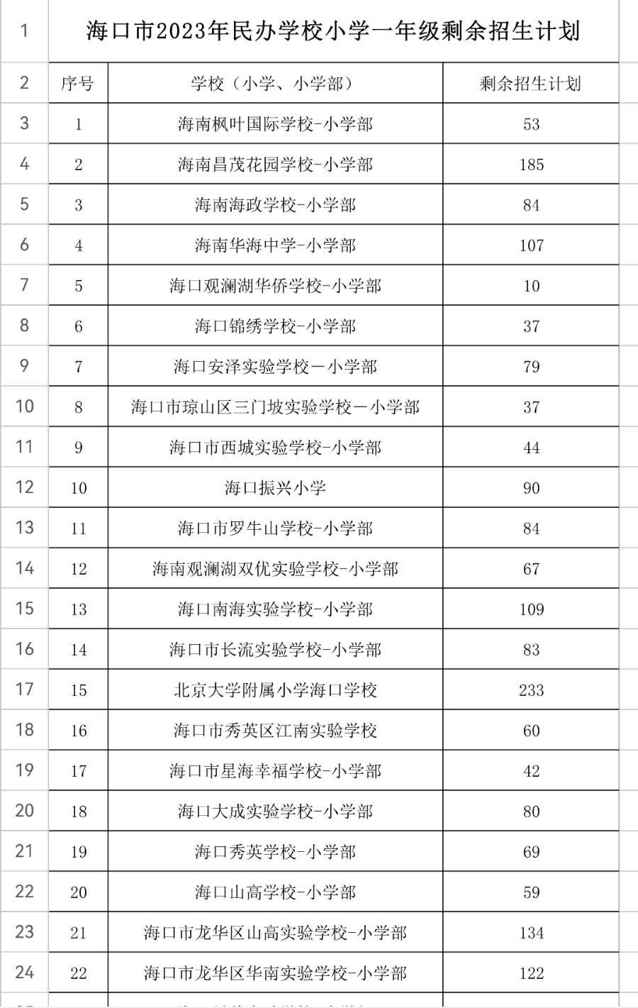 目前海口还有包括海口振兴小学、海南昌茂花园学校-小学部等31所民办学校小学一年级剩余招生计划,有意申报的家长可及时申报。