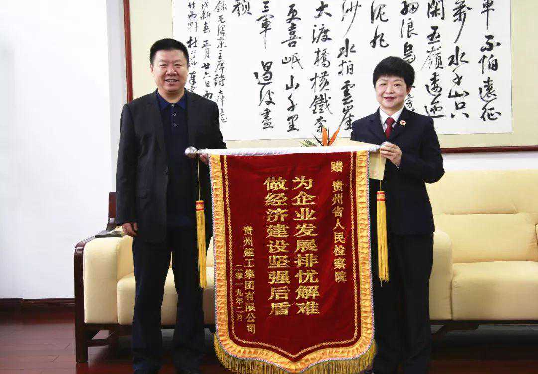 3月27日,贵州建工集团有限公司负责同志到省检察院登门致谢并赠送“为企业发展排忧解难,做经济建设坚强后盾”锦旗。省检察院党组书记、检察长傅信平,党组成员、副检察长余敏,检委会专职委员邓德禄与贵州建工集团有限公司总经理洪贵云一行5人进行了座谈。