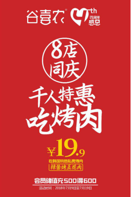 为庆祝活动成功举行,谷喜农推出了千人特惠吃烤肉活动,在18年7月9日到7月19日期间,凭微信转发谷喜农官方微信活动和其他平台购买或互动,可线下门店19.9元购买原价58元韩国特色私房烤肉-辣酱烤五花肉1份,限量1000份,每桌仅限兑换一份,兑完为止。除此之外,年度充值大回馈充500得600特惠活动也顺利展开,此次活动8店通兑。