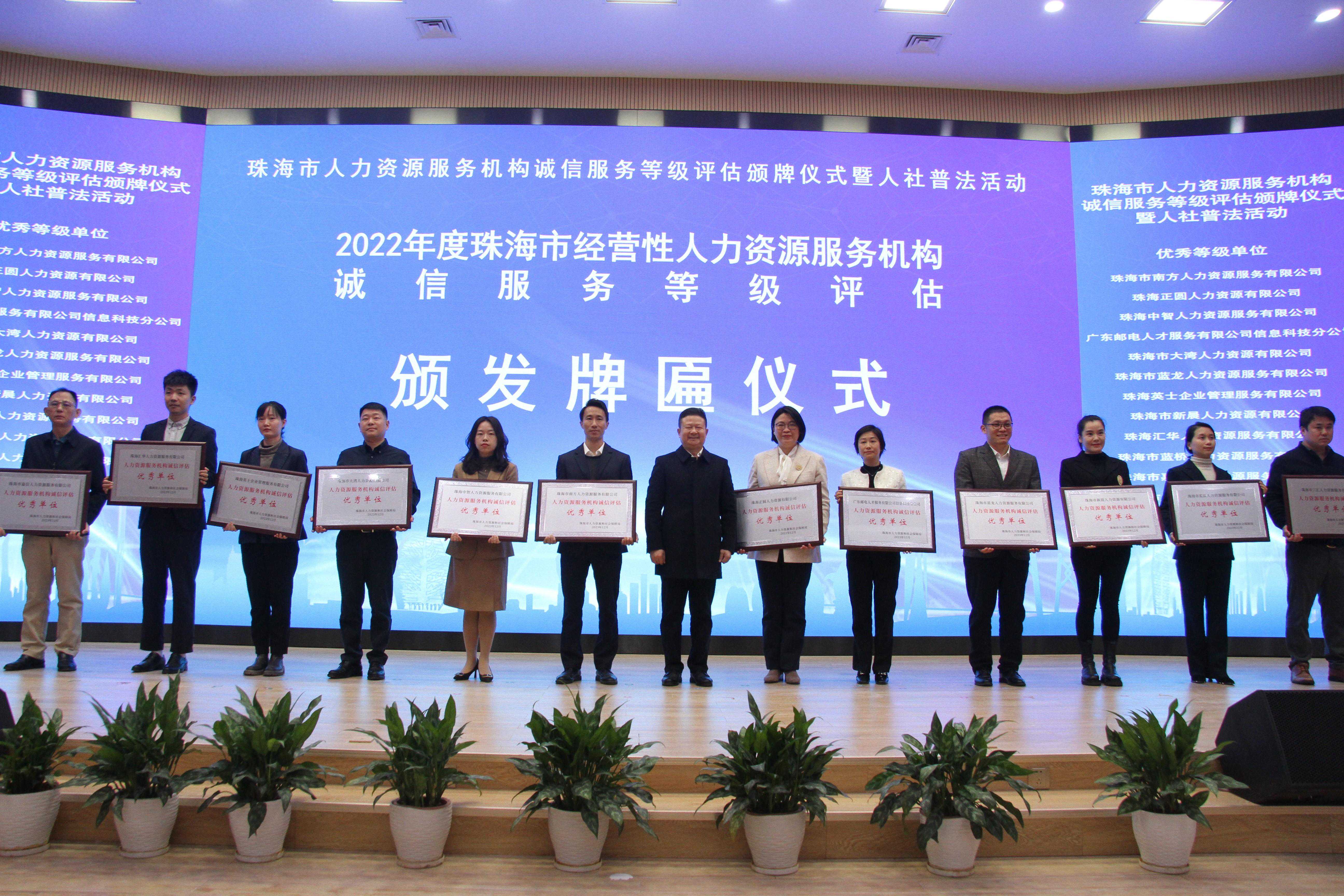 12月27日,“珠海市人力资源服务机构诚信服务等级评估颁牌仪式暨人社普法活动”在珠海市高技能人才公共实训中心珠澳示范基地成功举行。各人力资源服务机构以及人力资源协会代表等超150人参加活动。