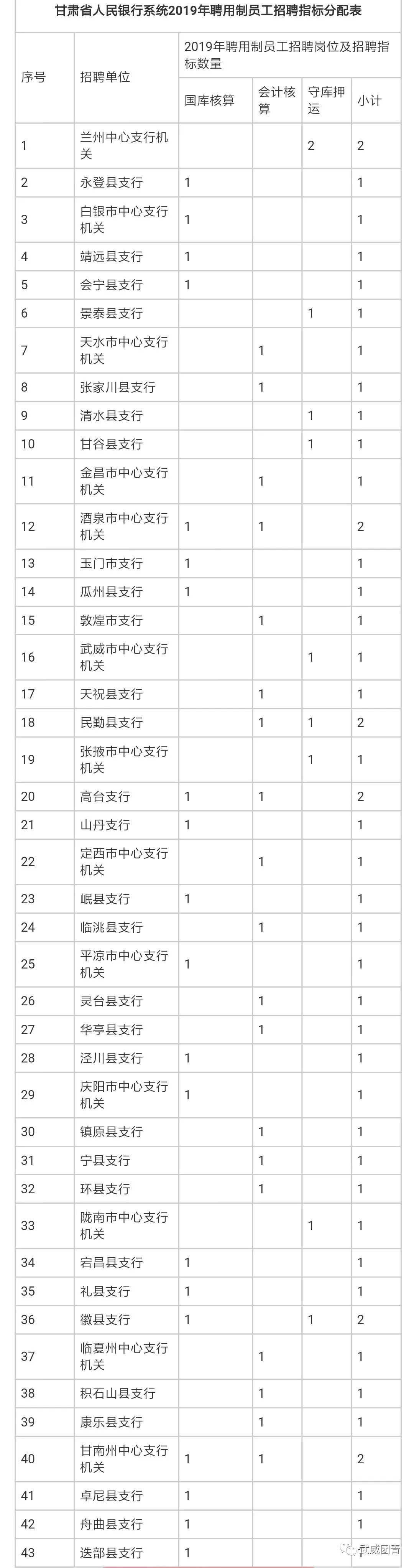 根据工作需要,经中国人民银行总行批准,甘肃省人民银行系统面向社会公开招聘业务操作岗位聘用制员工49人,其中,国库核算岗位20人,会计核算岗位19人,守库押运岗位10人。现将有关事项公告如下:招聘对象甘......