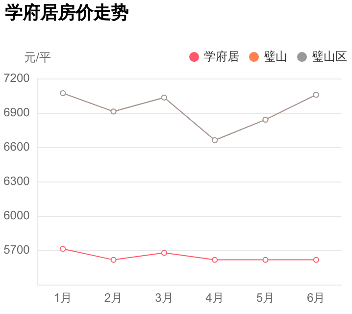 房价行情截止2020年6月,小区挂牌均价为5715元/平方米,比璧山均价(0.75万/㎡)低约1796元,低出璧山区均价(0.75万/㎡)1796元。小区均价不高,有明显的价格优势,处于区域价格洼地。
