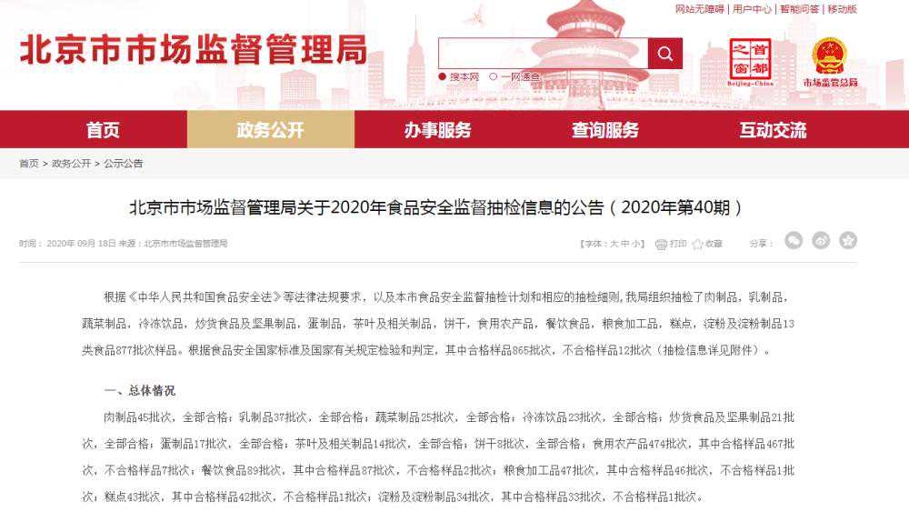 北京市市场监督管理局关于2020年食品安全监督抽检信息的公告(2020年第40期)