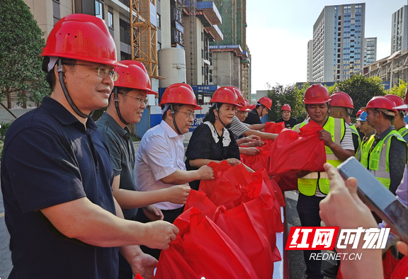 红网时刻9月2(通讯员何媛)近日,为落实湖南省住建厅开展党史学习教育“我为群众办实事”实践工作部署,省住建厅第五党支部和省建筑业协会党支部组织多个项目开展“送清凉保安全”关爱农民工慰问活动,为近三千名农民工发放凉茶、藿香正气水、毛巾和口罩等防暑防疫物资,给奋战在高温烈日下的一线工友们送去行业管理部门和行业协会的关心关怀。