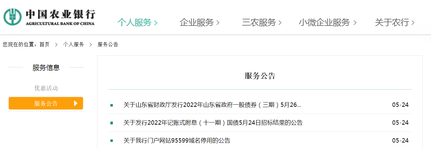 5月24日,中国农业银行在其官网连续发布了三条公告。关于农行门户网站95599域名停用的公告关于发行2022年记账式附息(十一期)国债5月24日招标结果的公告农行将于2022年5月25日发售2022年......